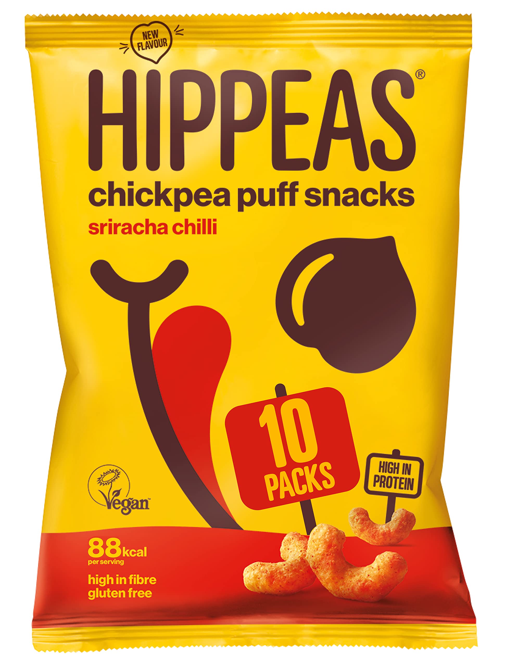 Pack of 10 bags, 78g each - Sriracha. Our healthy, vegan, dairy-free chickpea puffs are the perfect treat! These puffs, like all our other products, contain fewer than 100 calories per serving, and are low in sugar, fat, and carbohydrates. Chickpea puffs are the perfect alternative to other free snacks like plantain chips, hummus chips, quinoa chips, roasted corn sprouts, and vegetable chips. A much lighter and healthier option than sugary cakes, cookies, crackers, and popcorn. High in plant-based protein and fiber. The ideal gluten-free snack for your vegan picnic basket. Our puffs are made from real, natural ingredients with no nasties added. The whole family can enjoy our spicy and salty chickpea treat. A great alternative to nuts or pretzels, Hippeas are a perfect snack for adults, whether enjoyed with beer or wine, or packed into a delicious sandwich for your child's lunchbox! You'll want to add them to your weekly grocery list once you've tried them! Also available in 22g Snack Share Bags. INGREDIENTS Chickpea flour (39 ), quinoa, tapioca flour, sunflower oil, sriracha seasoning (10 ) (spices [red and green peppercorns], chili pepper], rice flour, sugar, salt, garlic, natural flavoring, citric acid, spirit vinegar, paprika extract, sunflower oil, antioxidant: rosemary extract, brown rice proteinHippeas Hot Chilli Sriracha Pois chiche Puff Vegan Crisps 10 sacs à partager de 78 g À base de plantes, source de protéines et de fibres, sans gluten et saveurs artificielles, léger, croquant, 91 calories par portionDESCRIPTION DU PRODUIT DESCRIPTION DU PRODUIT Lot de 10 sacs de 78 g chacun - Sriracha Nos collations végétaliennes et sans produits laitiers et saines aux pois chiches sont le régal parfait ! Ces bouffées, comme tous nos autres produits, contiennent moins de 100 calories par portion, faible en sucre, faible en gras et faible en glucides. Les bouffées de pois chiches sont l'alternative parfaite aux autres collations gratuites comme les croustilles de plantain, les croustilles de houmou, les chips de quinoa, les choux de maïs rôti et les chips de légumes. Une option beaucoup plus légère et plus saine que les gâteaux sucrés, les biscuits, les craquelins et le pop-corn. Riche en protéines et fibres à base de plantes. La collation idéale sans gluten pour votre panier de pique-nique végétalien. Nos bouffées sont fabriquées à partir de vrais ingrédients naturels sans ajouter de méchants. Toute la famille peut déguster notre gâterie épicée et salée aux pois chiches. Une collation au bar alternative aux noix ou aux bretzels, Hippeas se marie parfaitement avec la bière et le vin pour les adultes, ou avec un délicieux sandwich pour la boîte à lunch de votre enfant! Vous voudrez les ajouter à votre liste d'épicerie chaque semaine une fois que vous les aurez goûtés! Aussi disponible dans 'Snack' 22g Share Bags INGRÉDIENTS Farine de pois chiches (39 ), quinoa, farine de tapioca, huile de tournesol, assaisonnement à la sriracha (10 ) (épices [poivre rouge et vert), piment], farine de riz, sucre, sel, ail, arôme naturel, acide citrique, vinaigre spiritueux, extrait de paprika, huile de tournesol, antioxydant : extrait de romarin, protéine de riz brun