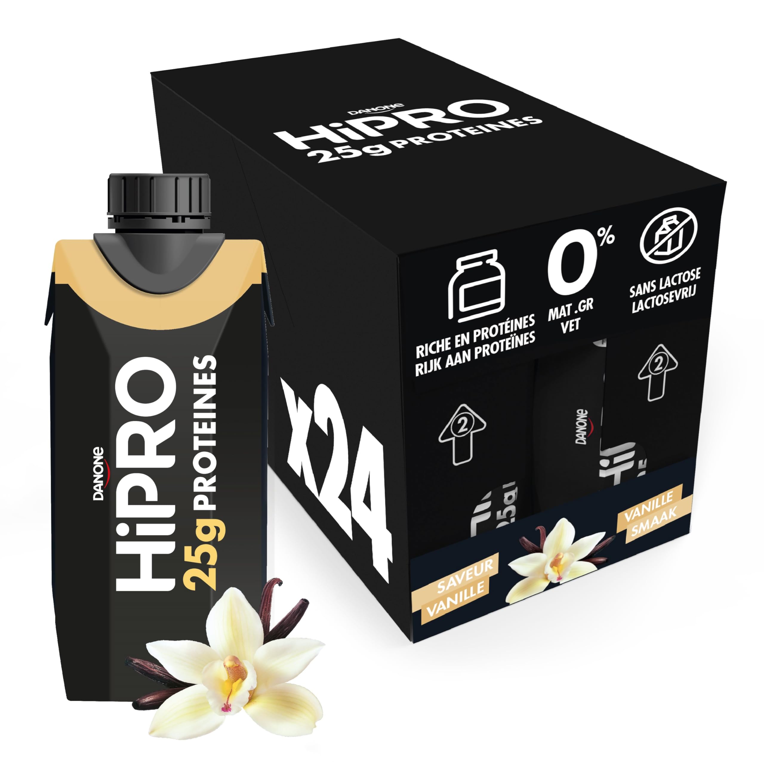 Danone HiPRO Boisson Protéinée - Vanille - 24 x 330ml - Riche en Protéines, Sans Sucres Ajoutés, Sans Lactose