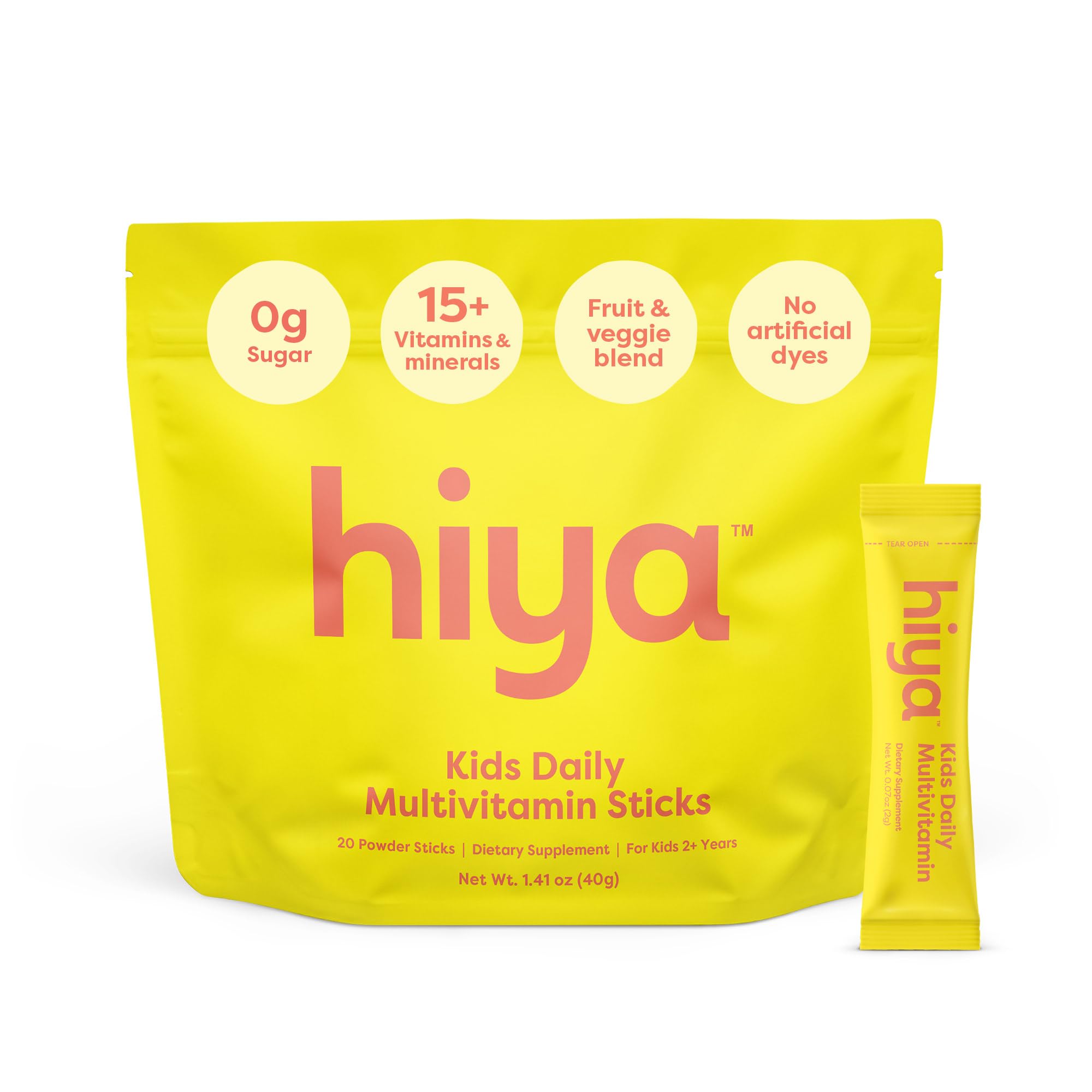 Hiya Kids Multivitamin 15+ Essential Vitamins & Minerals with Fruits & Veggies for Ages 2+, Supports Growth, Development & Immune, 0g Sugar 20 Stick Packs for Toddlers & Kids
