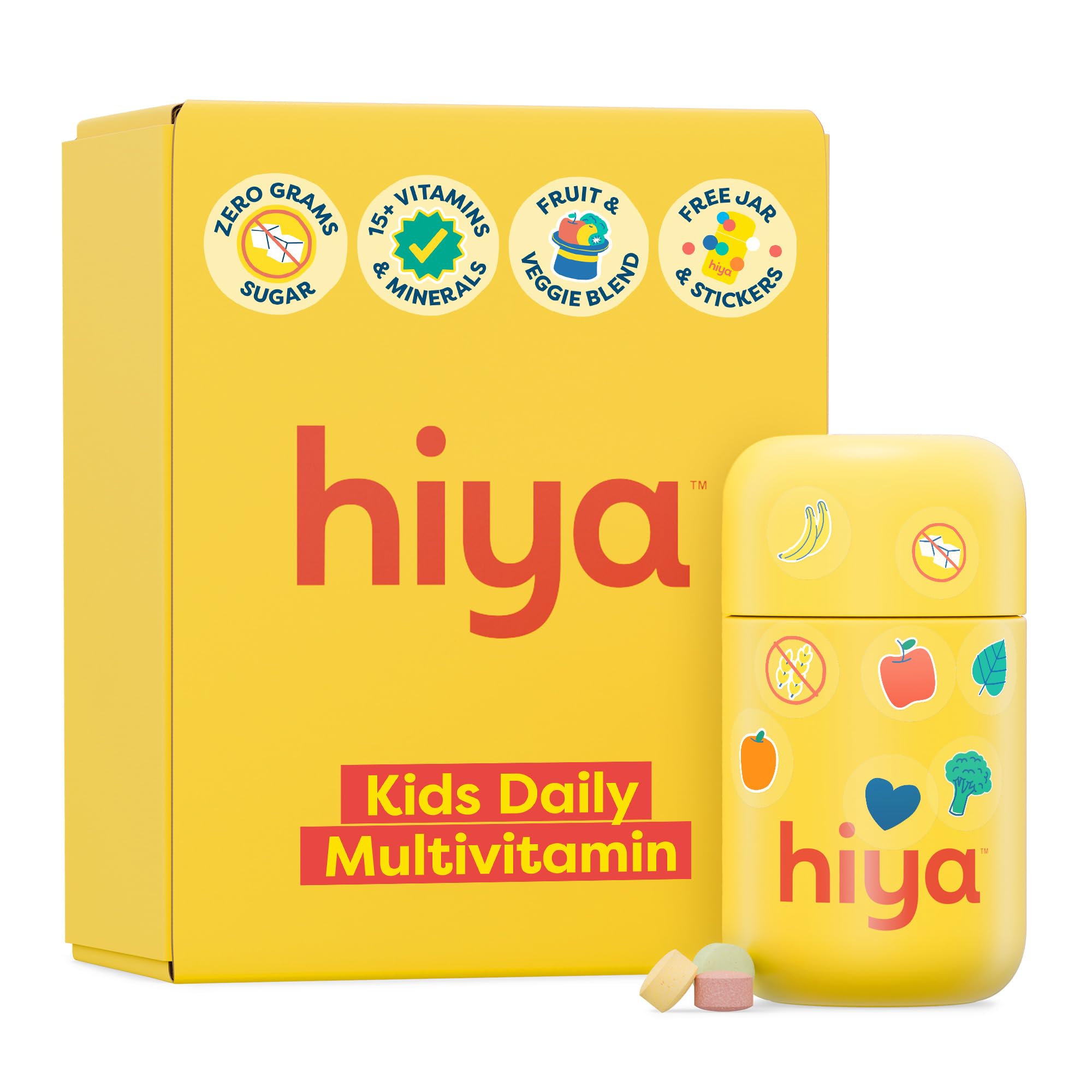 Highest Quality Standards: All Hiya childrens vitamins undergo rigorous third-party testing for heavy metals, microbials, and other contaminants. We are proud that all our products are Clean Label Project Certified, reflecting our ongoing commitment to excellence. Included Stickers Refillable Container: Each purchase comes with the refillable glass bottle and a sticker pack to decorate! Our toddler multivitamins are a healthy habit made fun. Tastes Like a Treat Without the Sugar: Naturally flavored and lightly sweetened with monk fruit with no added sugar. Our toddler vitamins have cherry, strawberry, tropical and green apple flavors and are a healthy daily ritual your child will actually enjoy taking. No Sugar, No Nonsense: Unlike sugary gummies, our vitamins for kids are made without added sugar, artificial dyes, or gummy junk. Just clean, effective multivitamins made for little bodies and trusted by pediatricians. . Daily Nutrients for Growing Kids: Each Hiya kids vitamins tablet delivers 15 essential vitamins and minerals including D, B12, C, Zinc, and more. Expertly formulated to help fill common gaps in modern kids' diets. .