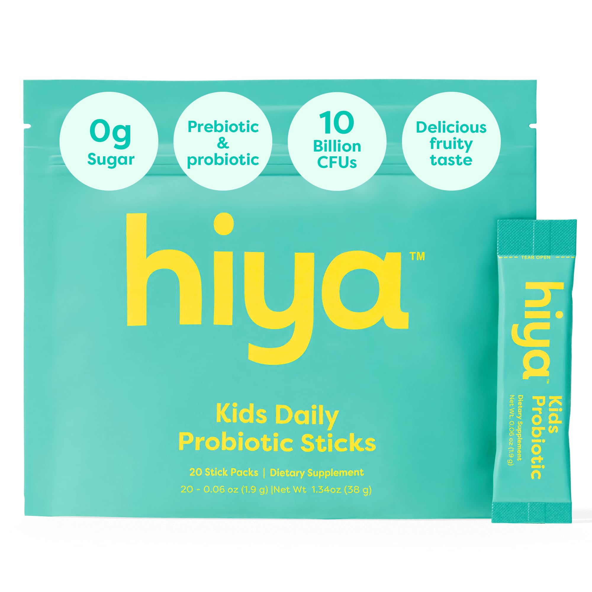 Hiya Kids Probiotic 10 Billion CFU with Clinically-Studied Strains for Ages 2+ Supports Gut Health & Immune 0g Sugar 20 Stick Packs for Toddlers & Kids
