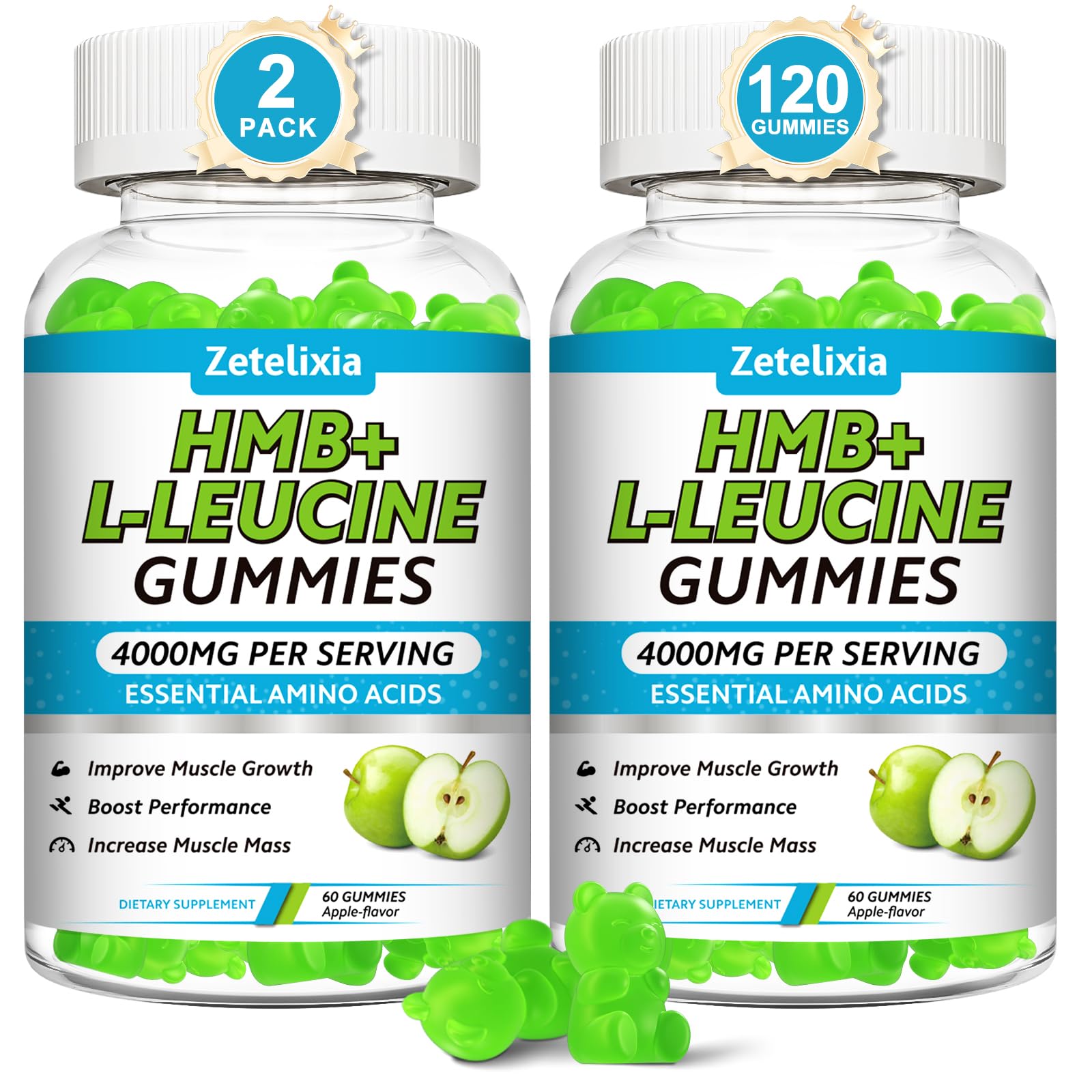 HMB and L-Leucine Gummies 4000mg HMB and Leucine Supplements Amino Acid Gummies for Men & Women Support Muscle Growth Muscle Relief and Workout Recovery Sugar-Free Vegan Apple Flavor 120 Count 60 Count (Pack of 2)