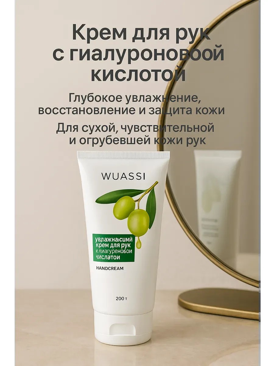 Увлажняющий крем для рук с гиалуроновой кислотой WUASSI — эффективное средство для ежедневного ухода за сухой и огрубевшей кожей рук. Благодаря комплексу активных увлажняющих и восстанавливающих компонентов крем глубоко питает, смягчает и улучшает общее состояние кожи.