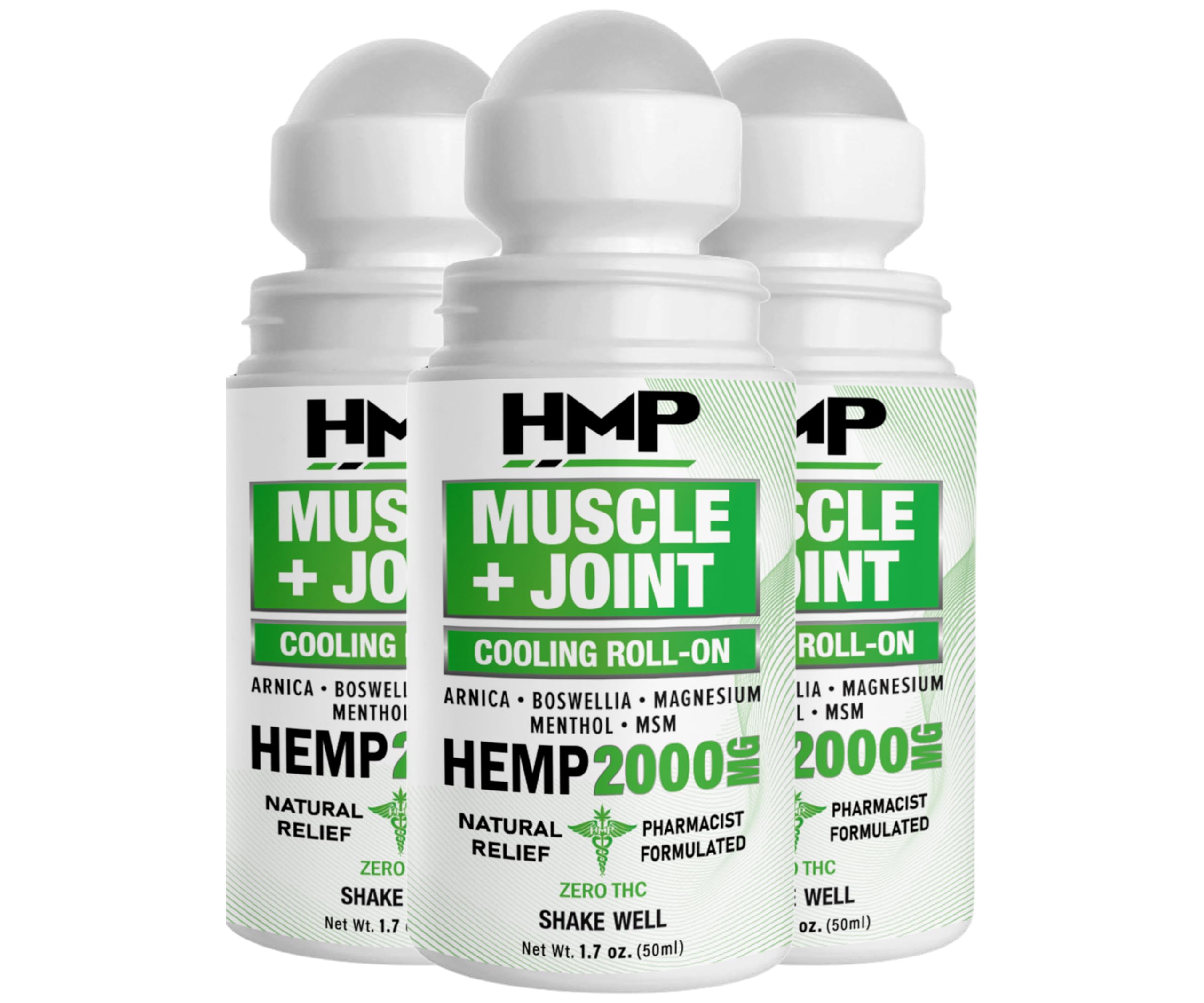 HMP Muscle & Joint Cooling Roll On - 2000MG Natural Formula with Menthol & Arnica - Fast Acting Hemp Support for Back Shoulder & Knee - Made in USA (3 Pack)