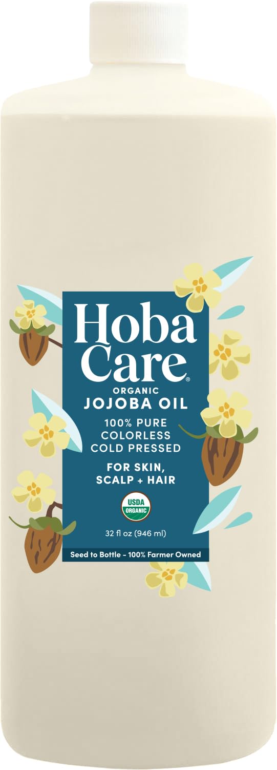 HobaCare Organic Clear Jojoba Oil, Colorless, Odorless for Skin Care, Hair, Beard Conditioning, Scalp Massage - 100% Pure Carrier Oil for Perfume or Soap Making, Hexane-Free, Long Shelf Life (32 oz)