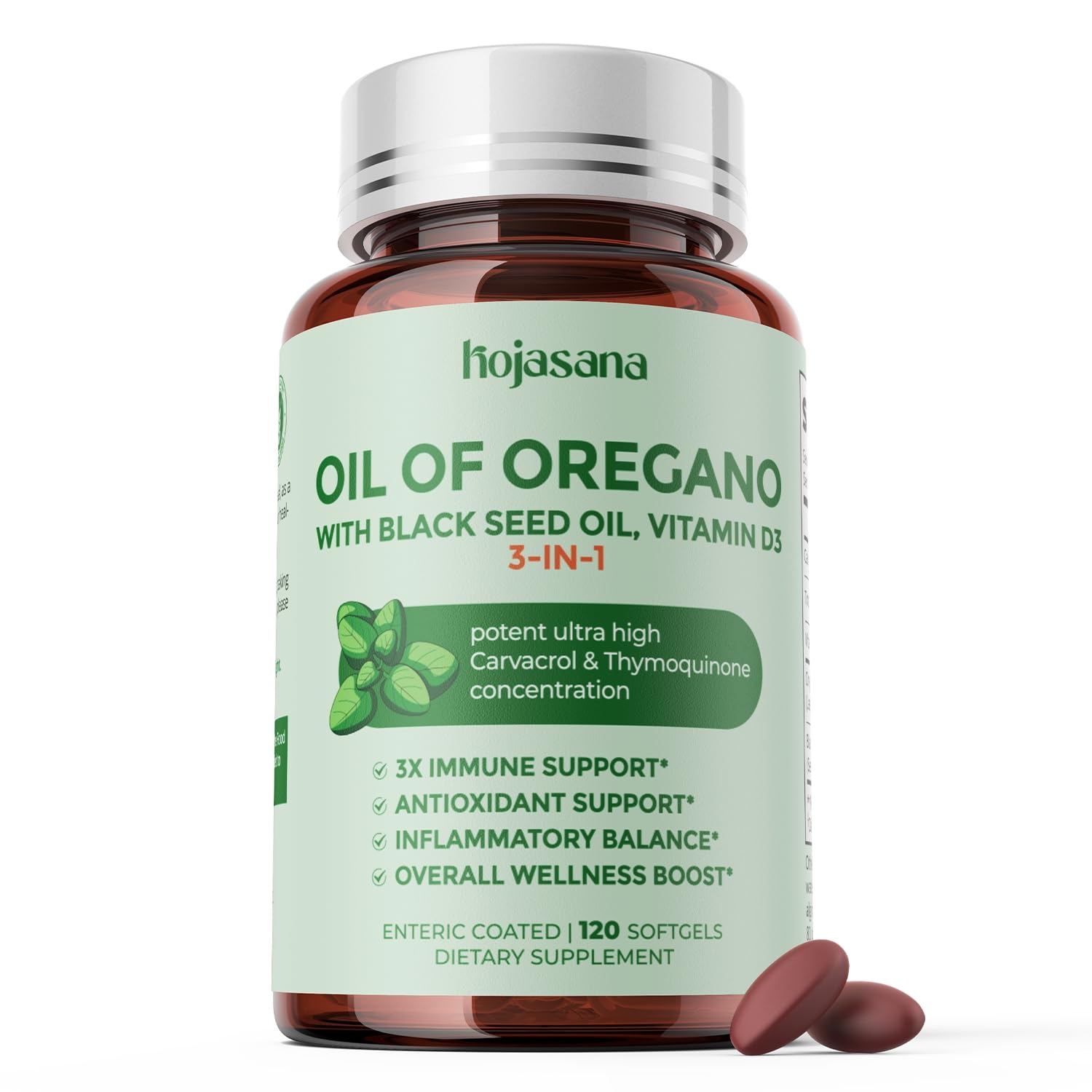 HojaSana Oregano Oil with Black Seed Oil Vitamin D3, 3-in-1 Enteric Coated Softgels Oregano Herbal Supplement for Immune Support & Overall Welleness, 60-Day Supply