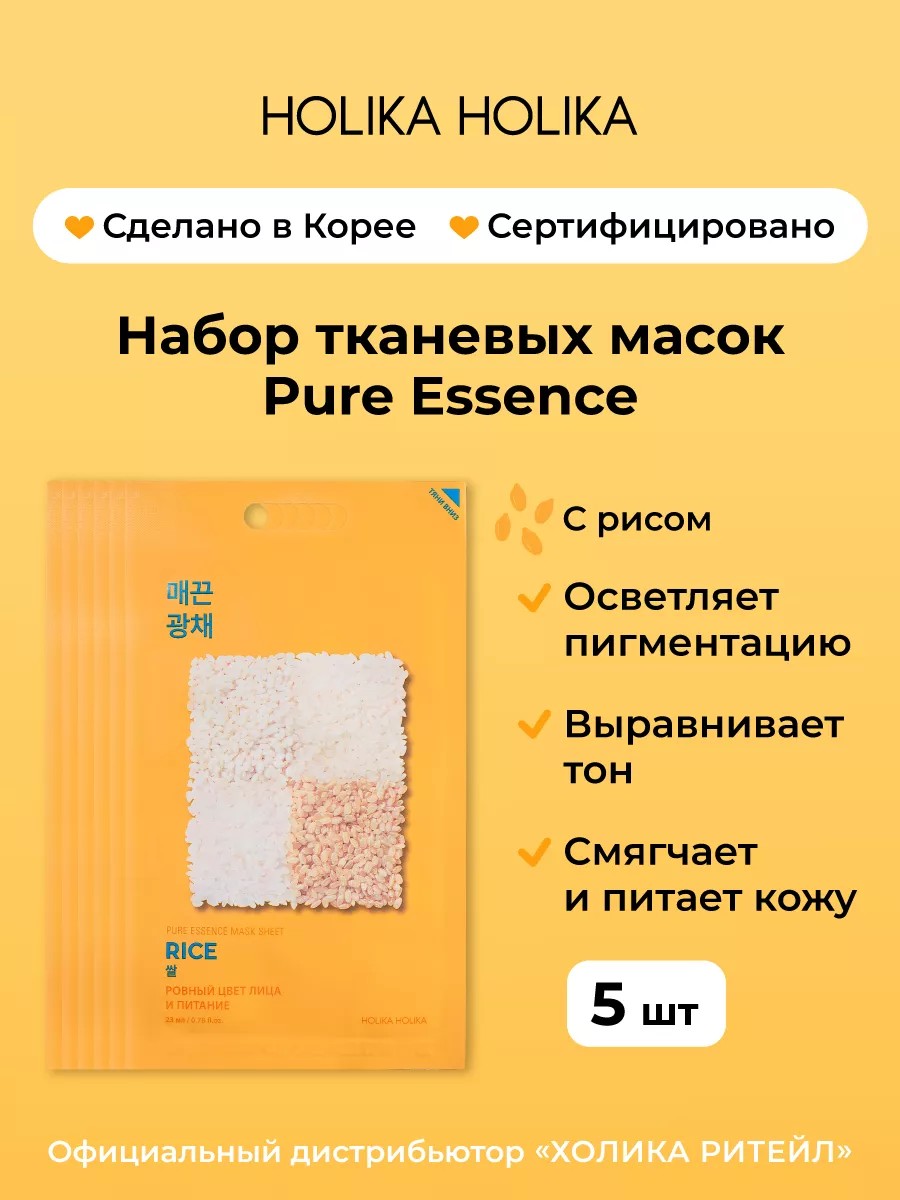 Pure Essence sheet masks from the Korean brand Holika Holika offer a sea of essence, a superfine base, and a solution to all your skin concerns. This set includes five sheet masks with rice extract that relieve dryness and combat age spots—suitable for sensitive skin. The ultra-fine base adheres like a second skin, and there's enough essence to cover your neck, elbows, and knees—so don't forget to moisturize them, too! Directions: Apply evenly to cleansed skin. Remove after 10-15 minutes, and pat any remaining essence into your skin with your fingertips. Cautions: Do not use around the eye area. Avoid contact with eyes. For external use only. Search terms: Korean cosmetics, facial care, face mask set, gifts for women, Korean cosmetics, cloth face mask set, gift set, box, Korean cosmetics set, gift set, skin care set, Holika sheet masks