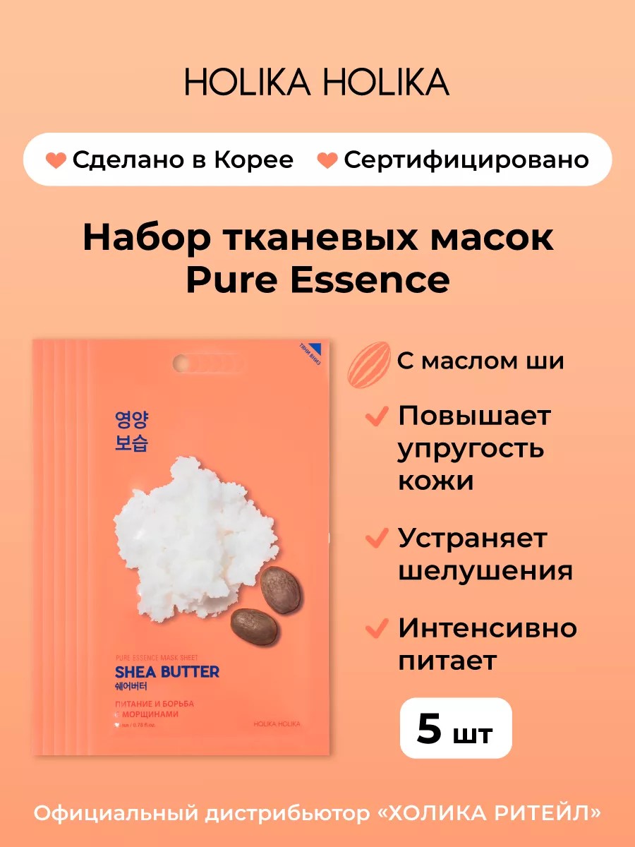 Тканевые маски Pure Essence от корейского бренда Holika Holika – это море эссенции, тончайшая основа и решение всех проблем кожи. В наборе пять тканевых масок для лица с маслом ши, которые питают кожу и прогоняют шелушения. Ультратонкая основа прилегает, как вторая кожа, а эссенции столько, что хватит на шею, локти и колени – так что не забудьте и их увлажнить! Способ применения: равномерно распределите маску по очищенной коже лица. Снимите через 10-15 минут, остатки эссенции вбейте в кожу подушечками пальцев. Предостережения: не используйте на области вокруг глаз, избегайте попадания средства в глаза, только для наружного применения. Слова для поиска: корейская косметика, уход за лицом, набор масок для лица, подарки для женщин, косметика Корея, маски для лица тканевые набор, подарочный набор, бокс, корейская косметика набор, подарочный набор, набор для ухода за кожей, холика тканевые маски