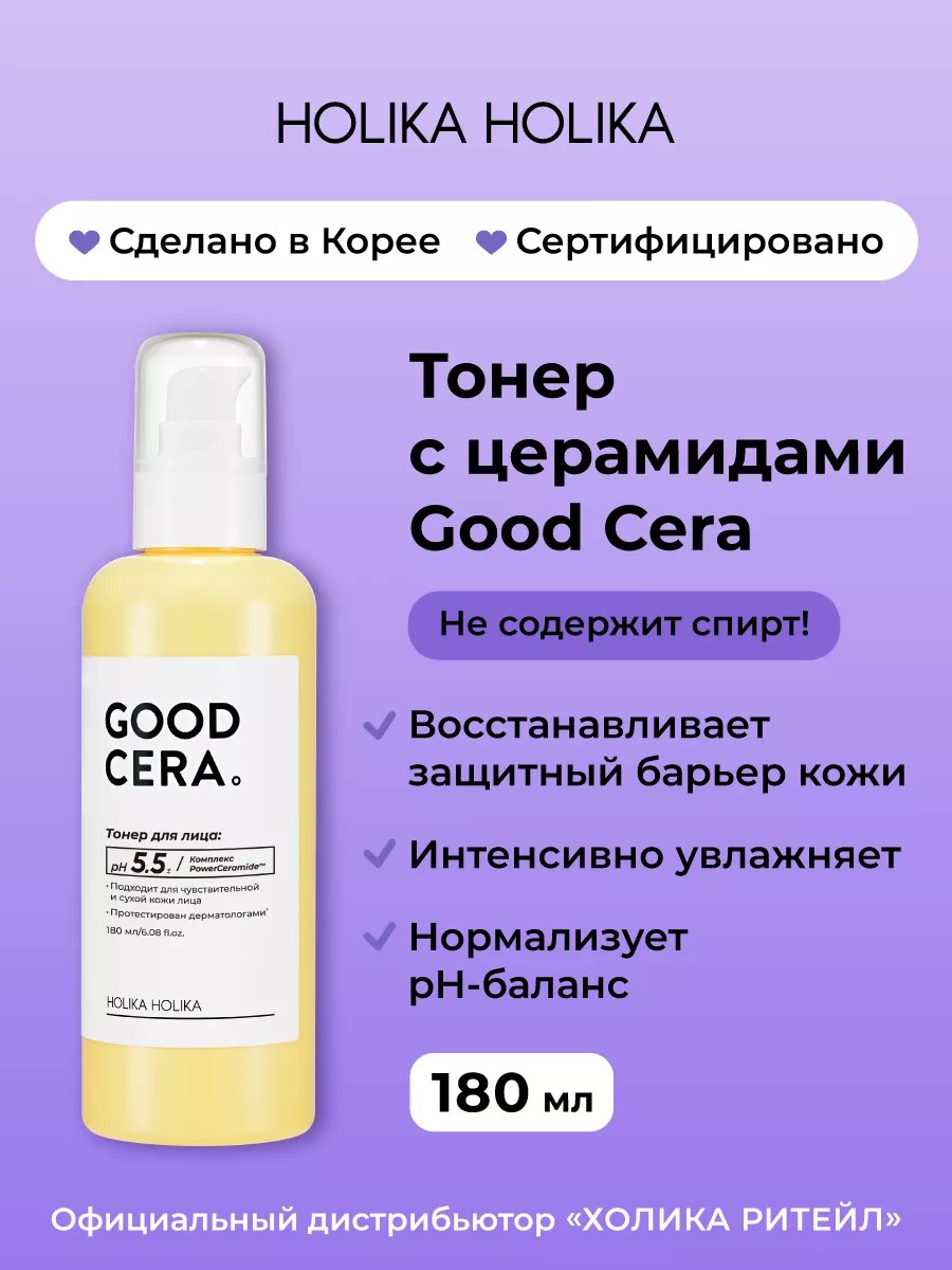 Тонер Good Cera Super Ceramide Toner от корейского бренда Holika Holika главный по увлажнению, восстановлению и нормализации pH кожи после умывания! Слабокислотная формула рН5.5 поддерживает оптимальный уровень, сохраняет здоровый защитный барьер. Средство мгновенно впитывается, не перегружает кожу, успокаивает раздражения, устраняет шелушения и не оставляет липкости! В основе тонера – церамиды и ниацинамид, которые восстанавливают защитный барьер эпидермиса, питают и препятствуют потере влаги.