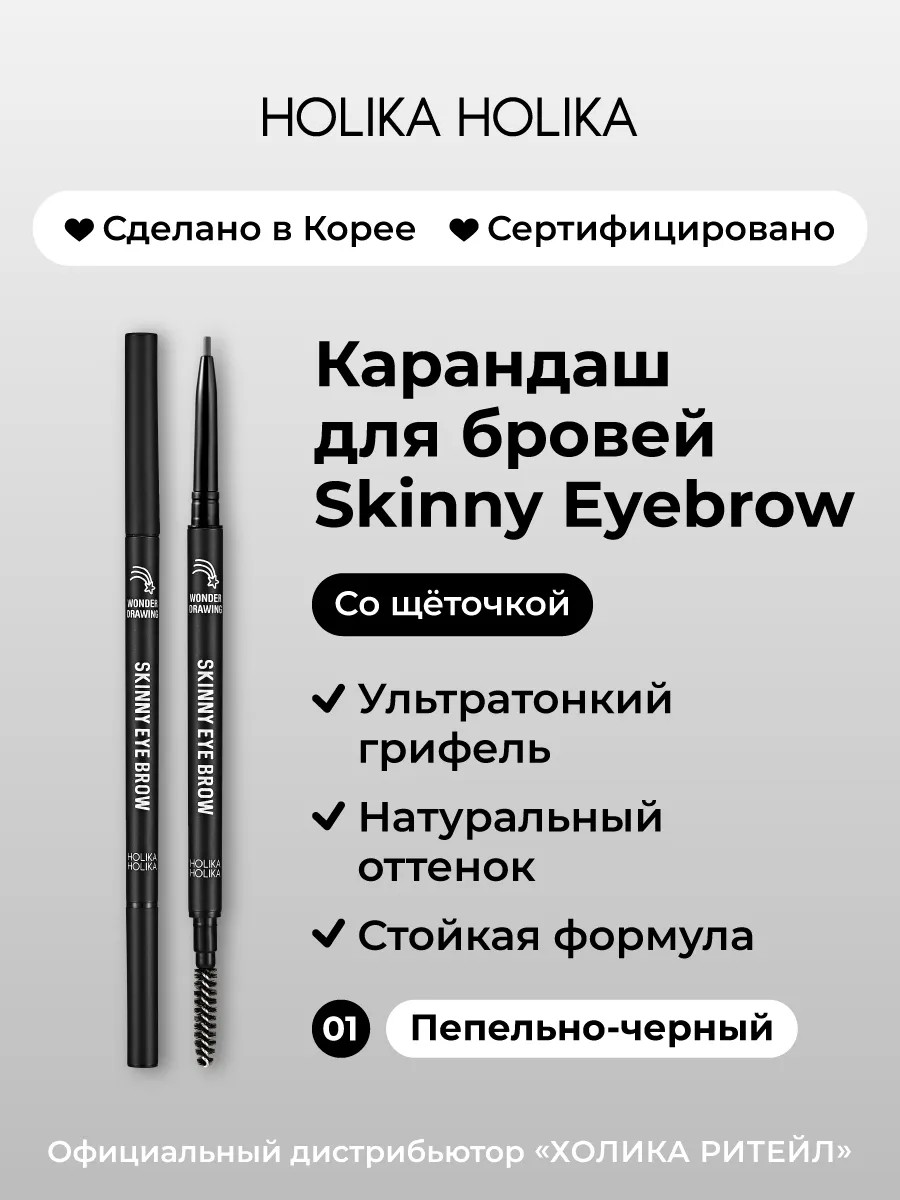 Тонкий карандаш для бровей Wonder Drawing Skinny Eyebrow 01 Ash Black от корейского бренда Holika Holika – это ваш надежный помощник в создании идеального макияжа. Этот продукт сочетает в себе высокое качество и инновационные технологии, характерные для корейской косметики, что делает его незаменимым в повседневном уходе за бровями. Карандаш обладает насыщенными красящими пигментами, которые обеспечивают стойкость цвета на протяжении всего дня. Это позволяет вам не беспокоиться о макияже, зная, что он останется безупречным с утра до вечера. Воск в составе фиксирует волоски, предотвращая их потерю формы, что особенно важно для создания четких и аккуратных линий. Уникальная формула с порошком жемчуга и маслом ши не только обеспечивает комфортное нанесение, но и ухаживает за кожей, питая и увлажняя её. Это делает карандаш не просто средством для макияжа, но и элементом ухода за бровями. Пепельно-черный оттенок карандаша идеально подходит для создания естественного образа, подчеркивая природную красоту ваших бровей. Он легко наносится, позволяя контролировать интенсивность цвета, что делает его подходящим для любого типа внешности. Этот карандаш станет отличным дополнением к вашей коллекции косметики для макияжа, обеспечивая профессиональный результат в домашних условиях. Используйте его в сочетании с другими продуктами корейской косметики для достижения наилучшего эффекта.