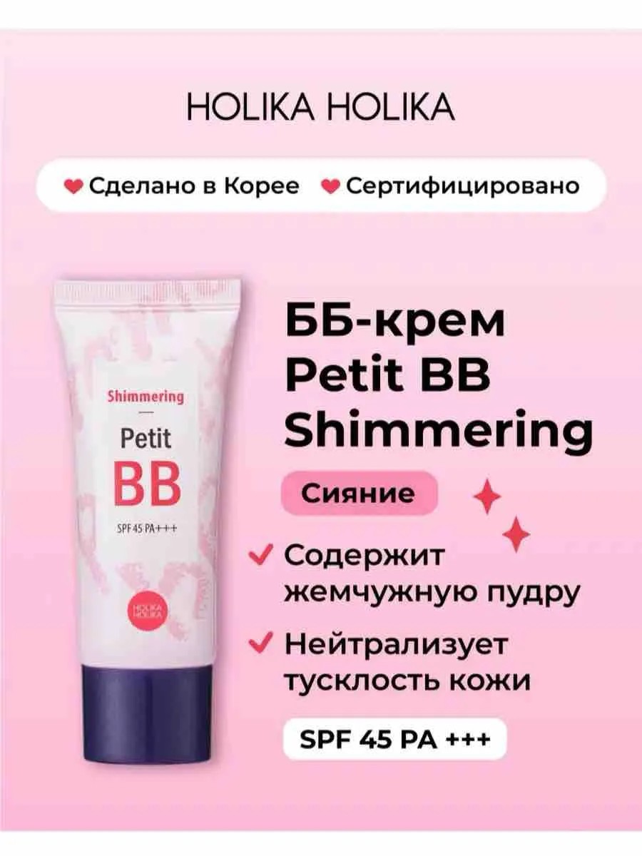 ББ крем для лица Petit BB Shimmering Holika Holika – это косметическое средство, которое придает коже эффект сияния. В его состав входит жемчужная пудра, микрочастицы которой создают здоровый и сияющий вид коже, рассеивая свет. Кроме того, крем обогащен корнем алтея и ниацинамидом для глубокого увлажнения кожи. Он эффективно скрывает неровности тону кожи, устраняет покраснения и может быть нанесен в несколько слоев. Обеспечивает защиту от солнечных лучей SPF45 PA+++, делая его также солнцезащитным кремом. Наносите небольшое количество крема на чистую кожу лица при помощи кисти, спонжа или кончиков пальцев, затем растушуйте. Этот продукт подходит для любителей корейской косметики, ищущих крем для лица, придающий сияющий эффект, и обеспечивающий защиту SPF45.
