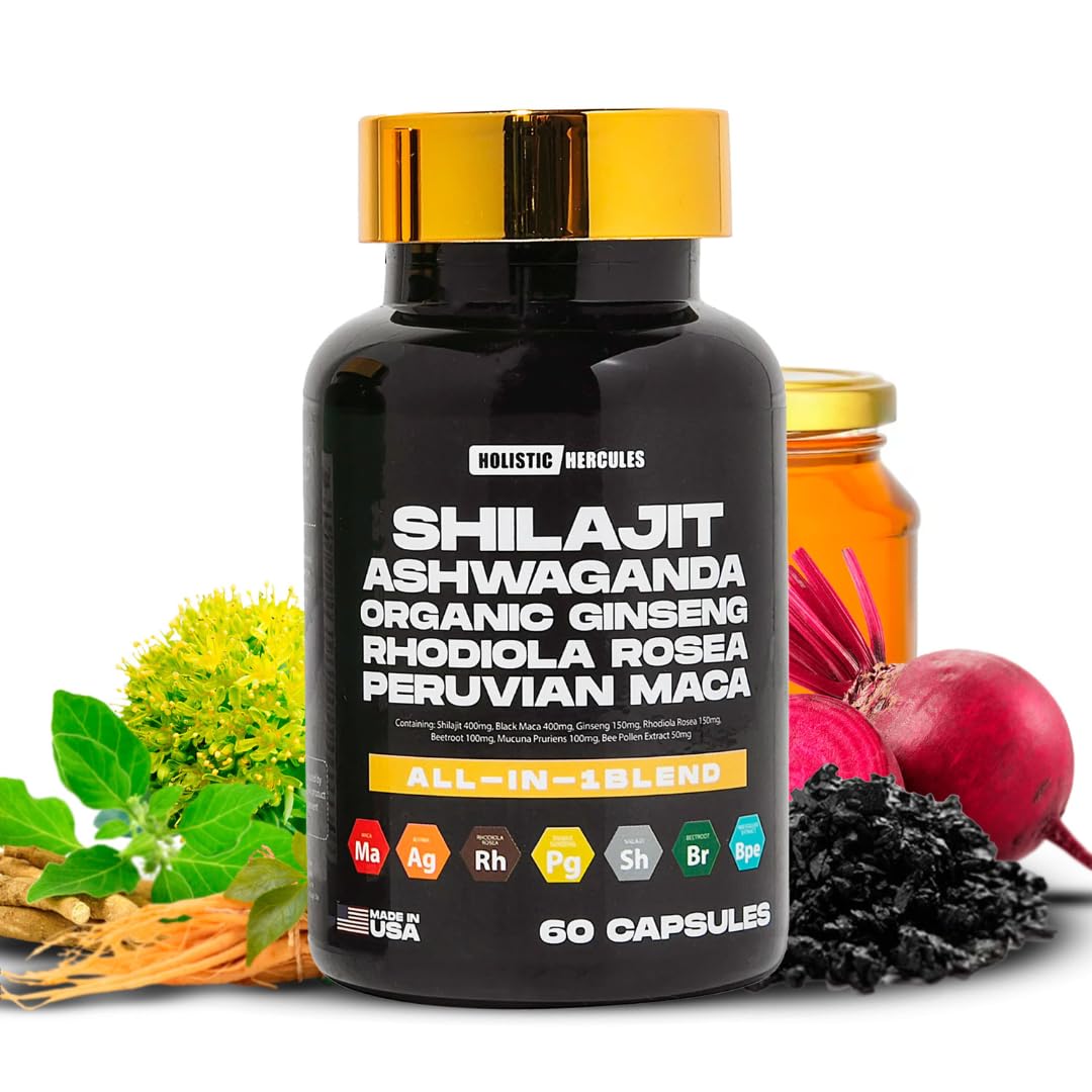 At Holistic Hercules, we prioritize quality and purity in our Shilajit Capsules, enriched with Beetroot and Mucuna Pruriens. Our product features Himalayan Shilajit Gold and Ashwagandha supplements, offering a blend of essential trace minerals to support your daily health needs. Designed with adaptogens and nutrient-rich ingredients, this comprehensive solution enhances your wellness routine and promotes a balanced and healthy lifestyle. Holistic Hercules Premium Shilajit Blend features Nature's Synergy Solution, a balanced 8-in-1 formula with Shilajit Supplement, Black Maca, Ashwagandha Capsules, Rhodiola, Panax Ginseng, Turmeric, Bee Pollen Extract, Mucuna Pruriens, and Beetroot. This blend is designed to support your wellness journey, providing a convenient and comprehensive supplement solution for a simplified routine. Holistic Hercules offers a Shilajit Supplement for both men and women, featuring Nature's Synergy Blend with 8 beneficial ingredients in one convenient capsule. This formula includes ashwagandha, shilajit, rhodiola rosea, and Panax ginseng, all packed into a single dosage. Support your wellness routine with Himalayan Shilajit and ashwagandha, ideal for those seeking herbal supplements with natural ingredients. Holistic Hercules offers Natural Shilajit Capsules, crafted for both women and men. Our unique 8-in-1 Nature's Synergy Blend features Himalayan Shilajit, beetroot extract, rhodiola rosea, ashwagandha extract, Panax ginseng extract, mucuna pruriens extract, bee pollen extract, and turmeric capsules. Sourced from the Himalayan Mountains, this resin is formed over many years on rock faces. Our Shilajit for Men formula contains over 80 trace minerals, including iron, calcium, magnesium, zinc, and fulvic acid. Discover Holistic Hercules' Ancient Fulvic Minerals, an all-in-one supplement combining Himalayan Shilajit, black maca, ginseng, rhodiola rosea, beetroot, mucuna pruriens, and bee pollen extract. This premium formula provides essential trace minerals to support overall wellness. Our Nature's Synergy Formula includes Shilajit, ashwagandha, and Panax ginseng, enriched with 8 potent ingredients. Enjoy a convenient alternative to traditional Shilajit resin, ginseng, and ashwagandha supplements!.