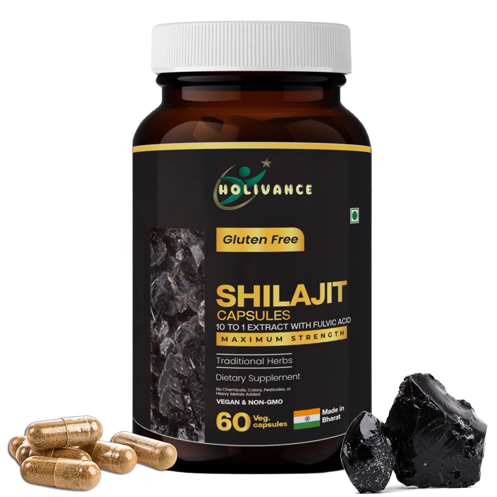 HOLIVANCE Himalayan Shilajit Capsules 500mg | 10:1 Purified Extract with Fulvic Acid & Trace Minerals | Vegan Non-GMO Gluten-Free | Herbal Dietary Supplement 60 Veg Capsules