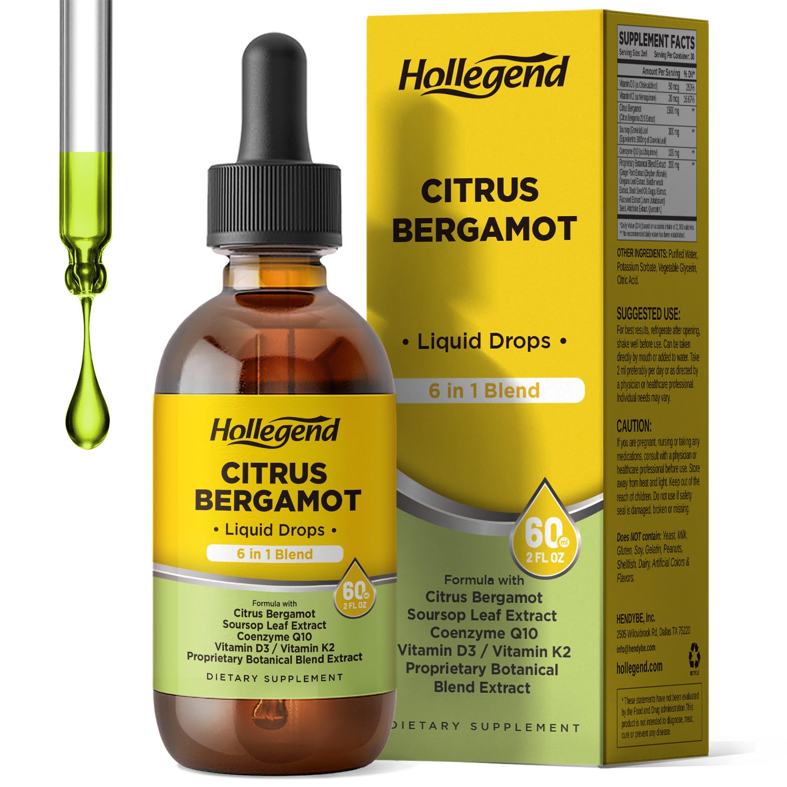 Tasty Lemon Flavor, Easy to Take:Made from high-quality herb extract, these liquid drops are free from artificial additives and preservatives. Ensuring you get the most out of this citrus bergamot supplement for maintaining optimal cholesterol health. High Absorption Bioavailability: Citrus Bergamot liquid drops are highly absorbable Stomach-friendly, offering higher bioavailability compared to capsules and gummies. Making it a simple and effective way to incorporate bergamot's benefits into your diet. Antioxidant and Immune Support:Go beyond basic cholesterol support with our rich antioxidant formulation. The combined power of bergamot and soursop provides antioxidant protection against oxidative, while Vitamin D3 strengthens immune health. This dual-action approach not only supports heart health but also contributes to your long-term vitality and wellness. Natural Cholesterol Support:Harness the natural power of Citrus Bergamot, extracted from the bergamot orange. This potent citrus extract helps maintain healthy cholesterol levels through its unique nutrient. Unlike synthetic alternatives, our bergamot-based approach offers gentle yet effective support that add into your daily wellness routine easily. Powerful 6-In-1 Citrus Bergamot Supplement:HOLLEGEND expertly crafted formula delivers a comprehensive blend of heart-healthy nutrients in every serving. With 1500mg of Citrus Bergamot extract, 300mg of Soursop leaf, 100mg of CoQ10, 50mcg of Vitamin D3, 20mcg of Vitamin K2, and 200mg of our proprietary Botanical Blend.