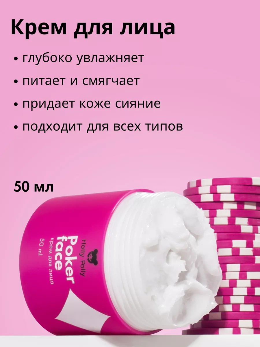 Увлажняющий крем для лица Holly Polly Poker Face cream 50 мл дает молодой коже глубокое увлажнение и питание, поддерживает оптимальный pH-баланс и препятствует обезвоживанию. Ухаживающая формула, направленная на восстановление аква баланса, поможет сохранить молодость всем типам кожи. Ультрапитательный бустер в баночке подходит для ежедневного домашнего, дневного и ночного, ухода за нормальной, очень обезвоженной, сухой и комбинированной, жирной кожей. Нежный женский аромат глазированного яблока поднимет настроение и зарядит на успех. Ставка на красоту, которая всегда сыграет!