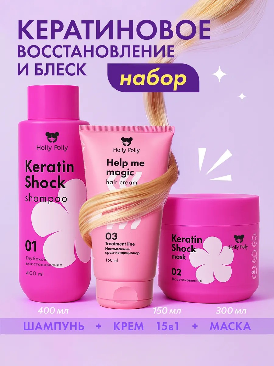 The "Keratin Restoration" hair set consists of three products: a 15-in-1 cream, shampoo, and hair mask. The Help me magic cream Holly Polly 15-in-1 leave-in smoothing cream-conditioner is a multifunctional product that is ideal for softening and heat-protecting all hair types. Its caring base contains a moisturizing protein complex that retains moisture and adds elasticity, smoothness, and shine.