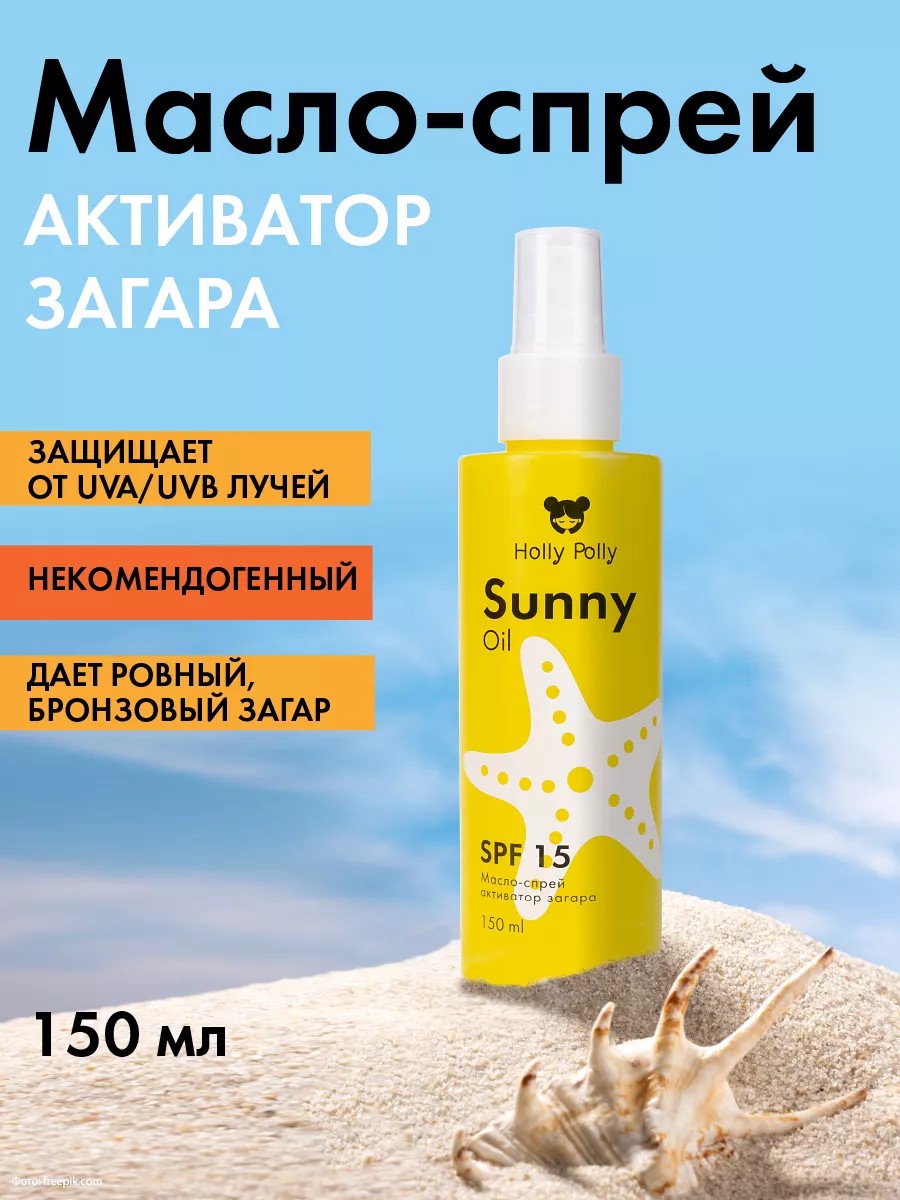 Солнцезащитное масло-спрей активатор загара Holly Polly Sunny 150 мл обеспечивает усиление идеального ровного бронзового загара и при этом борется с фотостарением и появлением пигментных пятен. Обладает легкой и нежной текстурой, которая легко наносится на тело. Средство быстро впитывается, не липнет и не оставляет жирных следов на одежде. Подходит для любого типа кожи, некомедогенно. Аромат сливочного кокоса добавит пляжного настроения и ярких впечатлений!