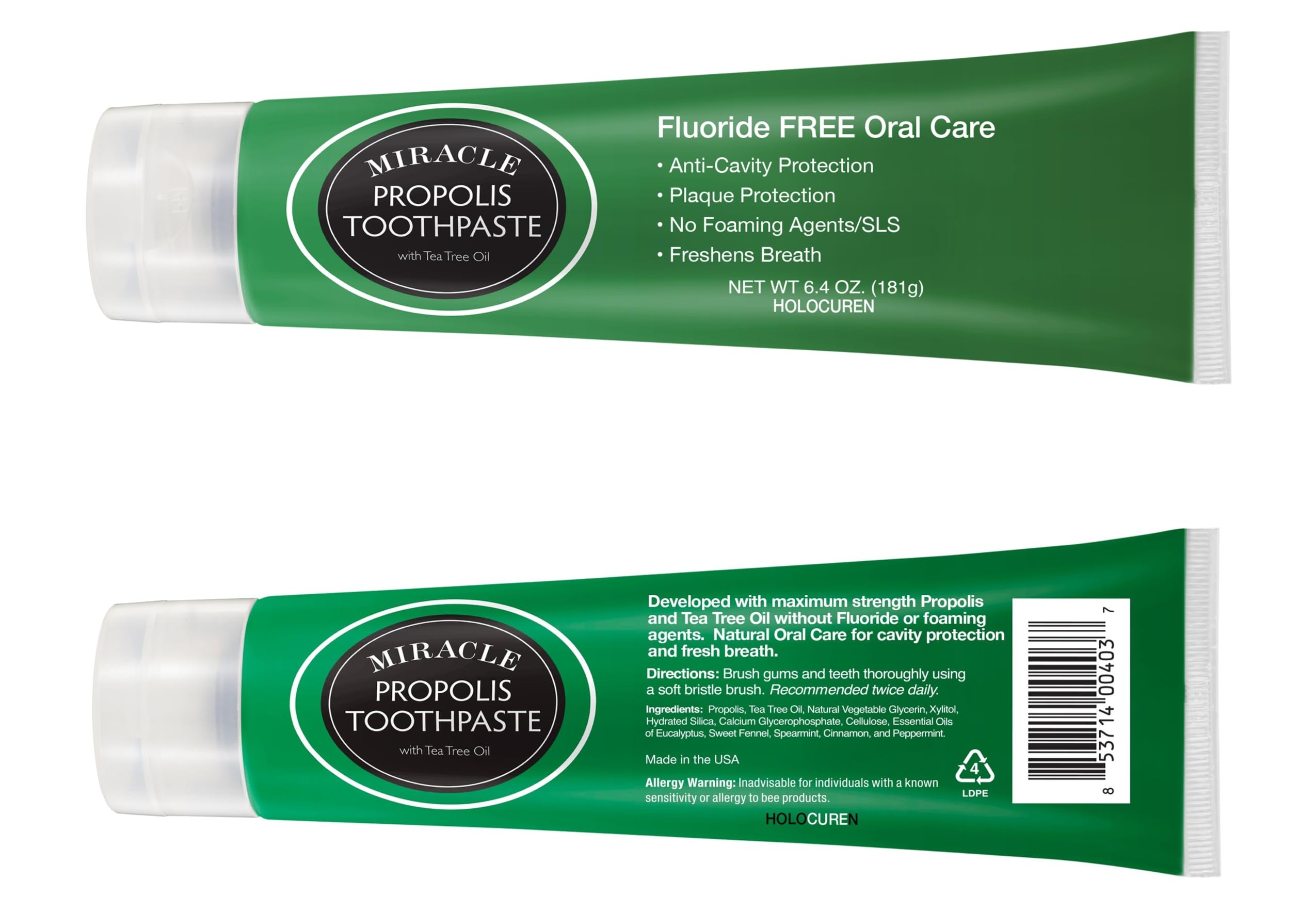 Holocuren Miracle Propolis Toothpaste 2-Pack Tea Tree Oil Fluoride-Free 12.8 oz (2 x 6.4 oz)