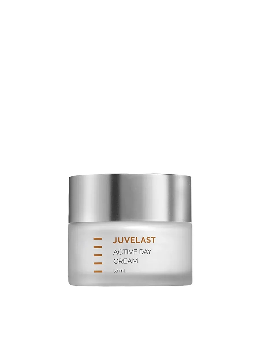 JUVELAST Active Day Cream, an active moisturizing facial cream, helps reduce the appearance of wrinkles, improve skin texture, and prevent age-related changes. Enriched with a copper-peptide complex, antioxidants, hyaluronic acid, natural oils, and ceramides, it nourishes, restores skin vitality, slows the aging process, and improves skin elasticity.
