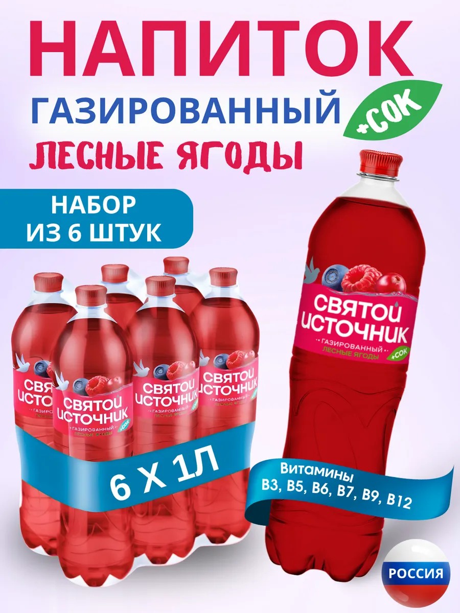 Откройте для себя освежающий и полезный газированный напиток Святой Источник с содержанием сока лесных ягод — идеальный выбор для тех, кто ценит здоровье, энергию и яркое настроение! В каждой бутылке объемом 1 литр, а в упаковке из 6 штук вы найдете настоящее сокровище природной чистоты и насыщенного ягодного вкуса.Этот уникальный газированный напиток создан из высококачественной воды, прошедшей строгий контроль, что гарантирует его безопасность и пользу для организма. В состав входит натуральный сок лесных ягод, богатый витаминами и антиоксидантами, которые помогают укрепить иммунитет, повысить уровень энергии и улучшить общее самочувствие. Витамины группы B — В3 (ниацин), В5 (пантотеновая кислота), В6 (пиридоксин), В9 (фолиевая кислота) и В12 (кобаламин) — способствуют нормализации обменных процессов, поддерживают работу нервной системы и улучшают обмен веществ. Эта газировка особенно приятна в жаркую погоду или после физических нагрузок. Эта сладкая вода с газом отлично утоляет жажду, насыщая организм витаминами и минералами. Благодаря натуральным компонентам и сбалансированному вкусу, напиток станет отличным дополнением к вашему рациону — будь то семейный ужин, активный отдых или деловая встреча. Упаковка из 6 бутылок по 1 литру — это практичное решение для дома, офиса или путешествий. Бренд Святой Источник гарантирует высочайшее качество продукции, соблюдение всех стандартов производства и заботу о вашем здоровье. Наслаждайтесь натуральным вкусом цитрусовых, пользой витаминов и бодрящим эффектом газировки — все это в одном освежающем напитке!