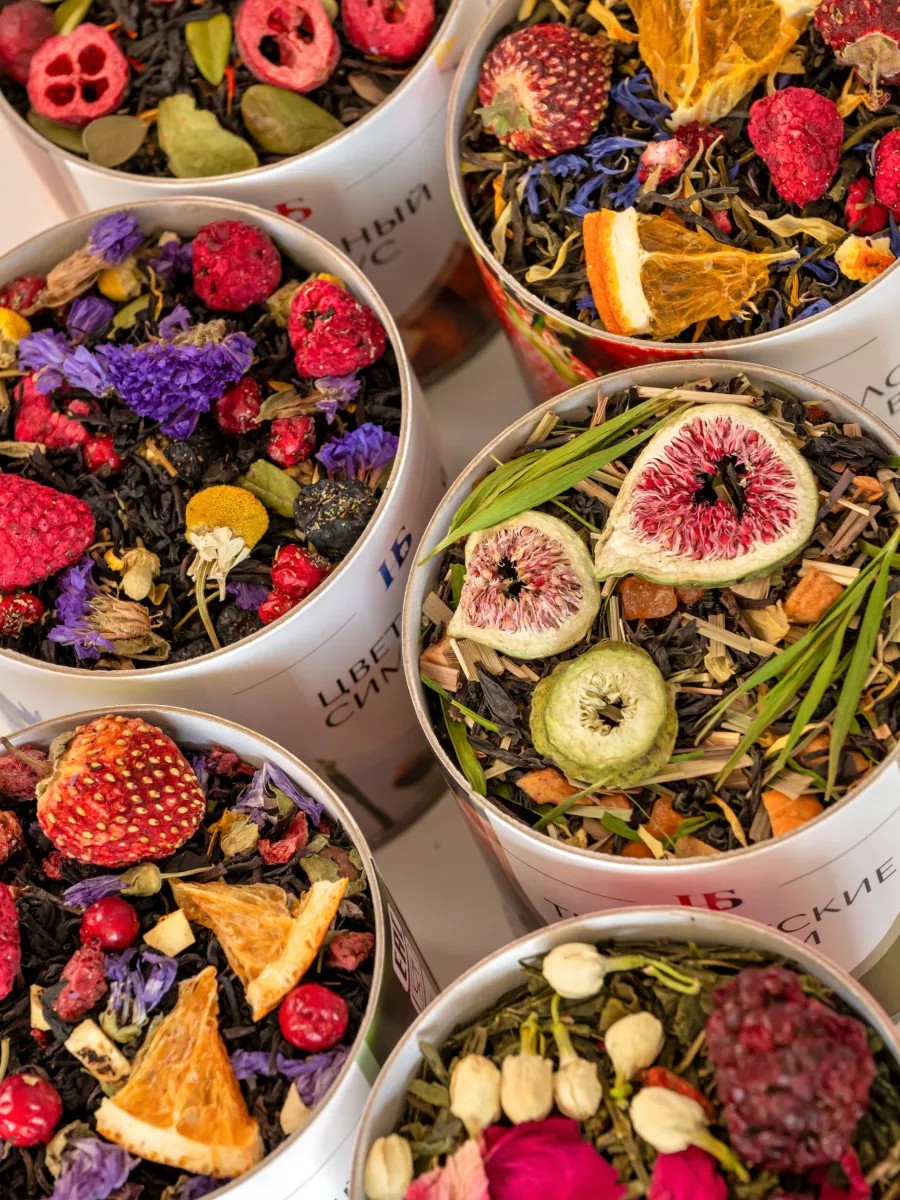 | Composition | black tea; orange; mint; currant; green tea; strawberry; raspberry; rose; forget-me-not; juniper; jasmine; grapefruit; cranberry; lingonberry; sea buckthorn; currant leaf; Assam; sencha |