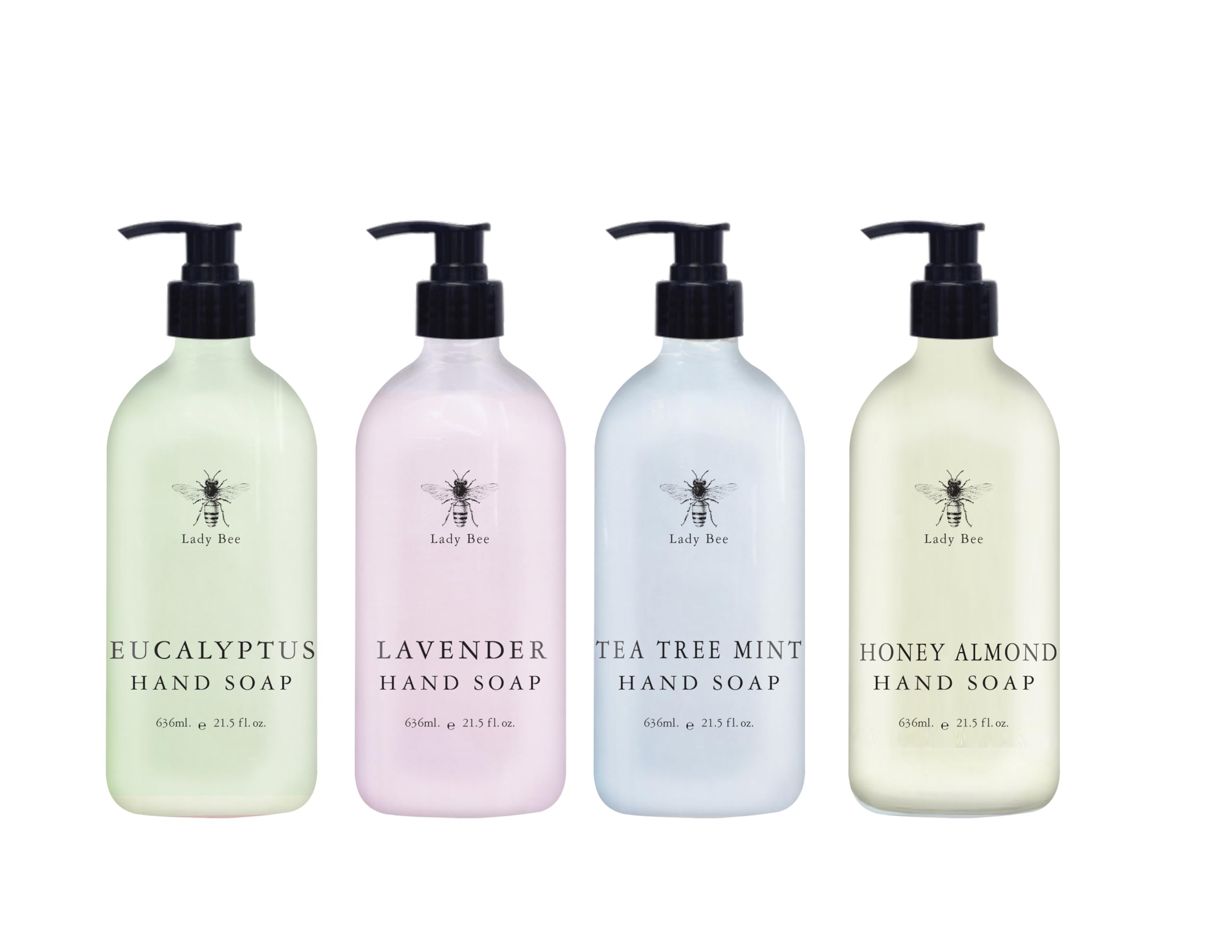 ELEGANT PACKAGING: Sophisticated clear bottles with the Lady Bee logo showcase the beautiful pastel-colored soaps, adding a decorative touch to any sink area. NATURAL FRAGRANCES: Four distinct aromatic blends featuring refreshing Eucalyptus, calming Lavender, invigorating Tea Tree Mint, and sweet Honey Almond. GENEROUS SIZE: Large 21.5 fl oz (636ml) bottles provide long-lasting use for bathrooms, kitchens, or any hand washing station. CONVENIENT DESIGN: Each bottle features an easy-to-use pump dispenser for mess-free dispensing and precise portion control. VARIETY PACK: Set includes 4 luxurious hand soap scents - Eucalyptus, Lavender, Tea Tree Mint, and Honey Almond, each in a generous 21.5 fl oz bottle.