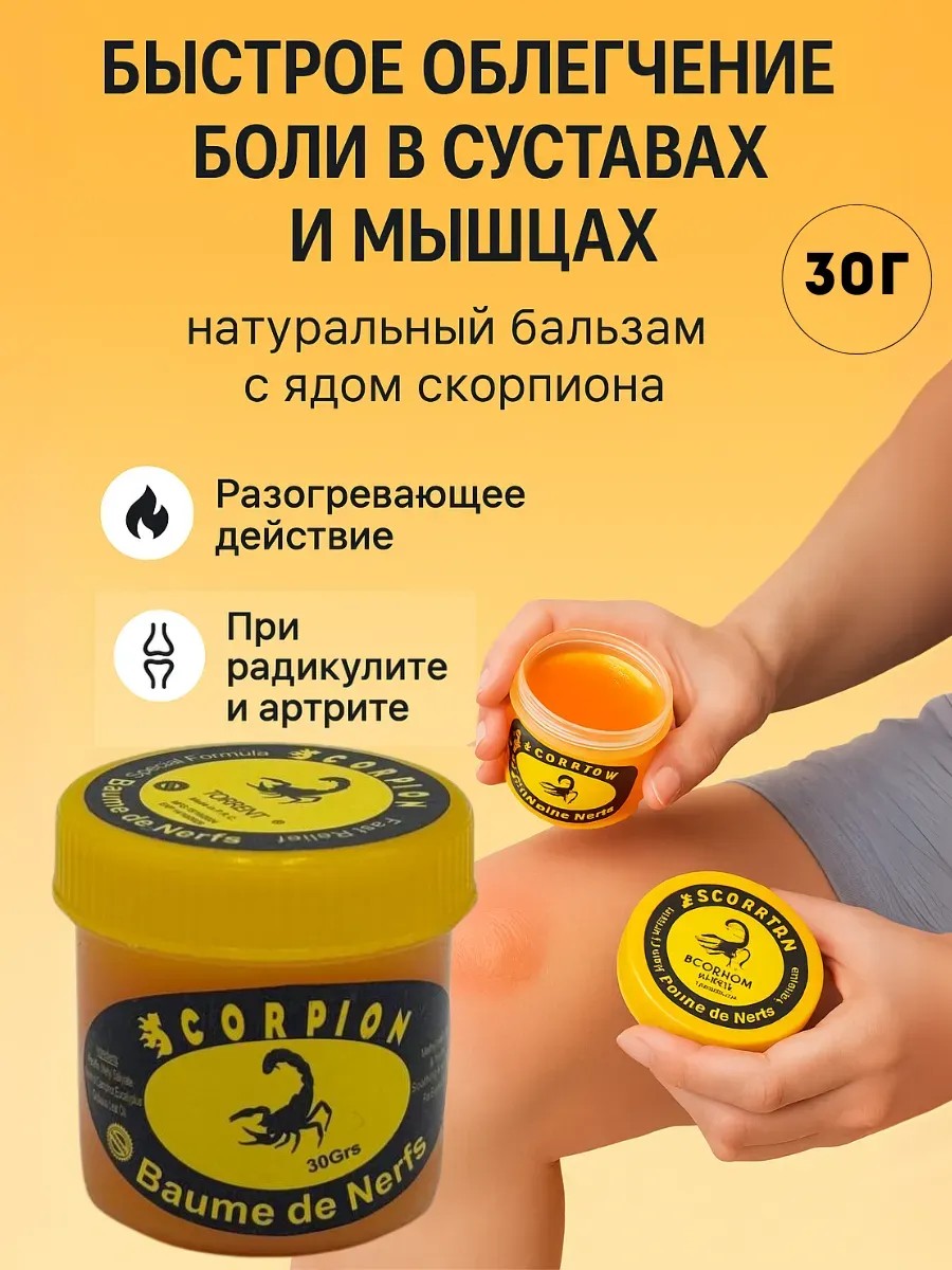 это натуральный бальзам с ядом скорпиона, предназначенный для эффективного снятия боли и восстановления подвижности. Обладает выраженным разогревающим эффектом, глубоко проникает в ткани и способствует улучшению кровообращения. Используется как бальзам от боли в суставах, а также при воспалении, скованности и отёках. Помогает при физических нагрузках и переохлаждении. Подходит в качестве бальзама от мышечной боли после тренировок или тяжёлого дня. Благодаря своей формуле, может использоваться как обезболивающий бальзам при хроническом или сезонном дискомфорте. Часто применяется как мазь от ревматизма — смягчает симптомы и способствует облегчению. Эффективен также как средство от боли в пояснице и шее. Универсальный помощник — мазь от боли в мышцах и суставах, которую удобно держать под рукой. Востребован как разогревающий бальзам в период простуд и переохлаждений. Это проверенный китайский бальзам от боли, основанный на традиционных рецептах. Применяется также как мазь от артрита, уменьшая воспаление. Подходит при обострении, как мазь от радикулита. Простой в применении, этот бальзам — отличное наружное средство при боли для дома, спортзала и дороги.