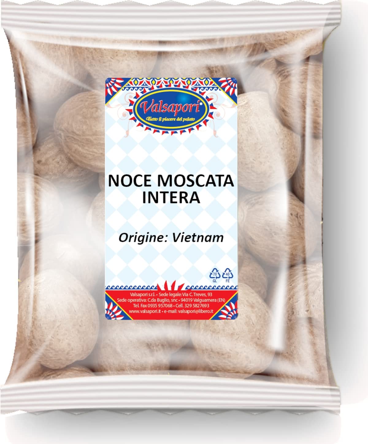 Whole Nutmeg: Whole nutmeg from natural cultivation, without the use of pesticides, additives, preservatives, or artificial chemicals. Premium Quality: Whole nutmeg perfectly preserved to retain its intense aroma and nutritional value. Raw Nutmeg: Its aromatic scent is immediately recognizable, and it retains a full, warm, and sweet flavor capable of instantly transforming a dish. Nutmeg in Cooking: Nutmeg enriches the flavor of mashed potatoes, meat and fish dishes, and can also be added to legume, vegetable, and stew soups. Valsapori, drawing on its extensive experience, harvests each nutmeg at the optimal time, when the concentration of essential oils is at its peak. The product's organoleptic properties are then verified, and only after passing this test is the product harvested by hand and finally left to dry slowly in the sun. Thanks to these processes, you get a natural product in your kitchen that fully retains its long list of active ingredients. Aromatic herbs and spices can completely transform the flavor of a dish, giving it an exceptional boost. The best way to enjoy them would be to grow them in your garden or on your terrace. But if that's not possible, we're here in Valsapori with our sun-dried Sicilian spices that will make growing them a worthwhile investment.Noix de muscade entière séchée au soleil – Enveloppe de 250 g sans gluten végétalien Épice exotique brute 100 naturelle – Noix de muscade entière au goût sucré (noix de muscade entière)DESCRIPTION DU PRODUIT Noix de muscade entière : noix de muscade entière provenant de culture naturelle, qui ne fait pas usage de pesticides, d'additifs, de conservateurs ou de produits chimiques artificiels. Qualité supérieure : noix de muscade entière conservée parfaitement pour préserver l'arôme intense et les valeurs nutritionnelles. Noyer de muscade crue : son odeur aromatique se fait immédiatement reconnaître et conserve un goût plein, chaud et doux capable de faire changer immédiatement de visage à un plat. Noyer de muscade en cuisine : la muscade enrichit le goût de purée de pommes de terre, secondes de viande et de poisson, mais peut également être ajouté aux soupes de légumineuses, légumes et légumes. L'entreprise Valsapori, du haut de son expérience, recueille chaque plante au bon moment, lorsque la concentration d'huiles essentielles est maximale, les propriétés organoleptiques du produit sont ensuite vérifiées et seulement après avoir passé ce test, le produit est récolté manuellement et enfin mis à sécher lentement au soleil pour obtenir le processus de séchage. Grâce à ces passages, vous obtenez dans vos cuisines un produit naturel qui conserve intégralement toute sa longue liste de principes actifs Les herbes aromatiques, ainsi que les épices, sont capables de changer complètement le goût d'un plat, en lui donnant une poussée exceptionnelle. Ce serait le meilleur moyen d'en profiter serait de les cultiver dans le jardin ou sur la terrasse. Mais si vous ne pouvez pas, nous sommes à Valsapori avec nos épices de Sicile séchées au soleil qui ne vous feront pas regretter la culture