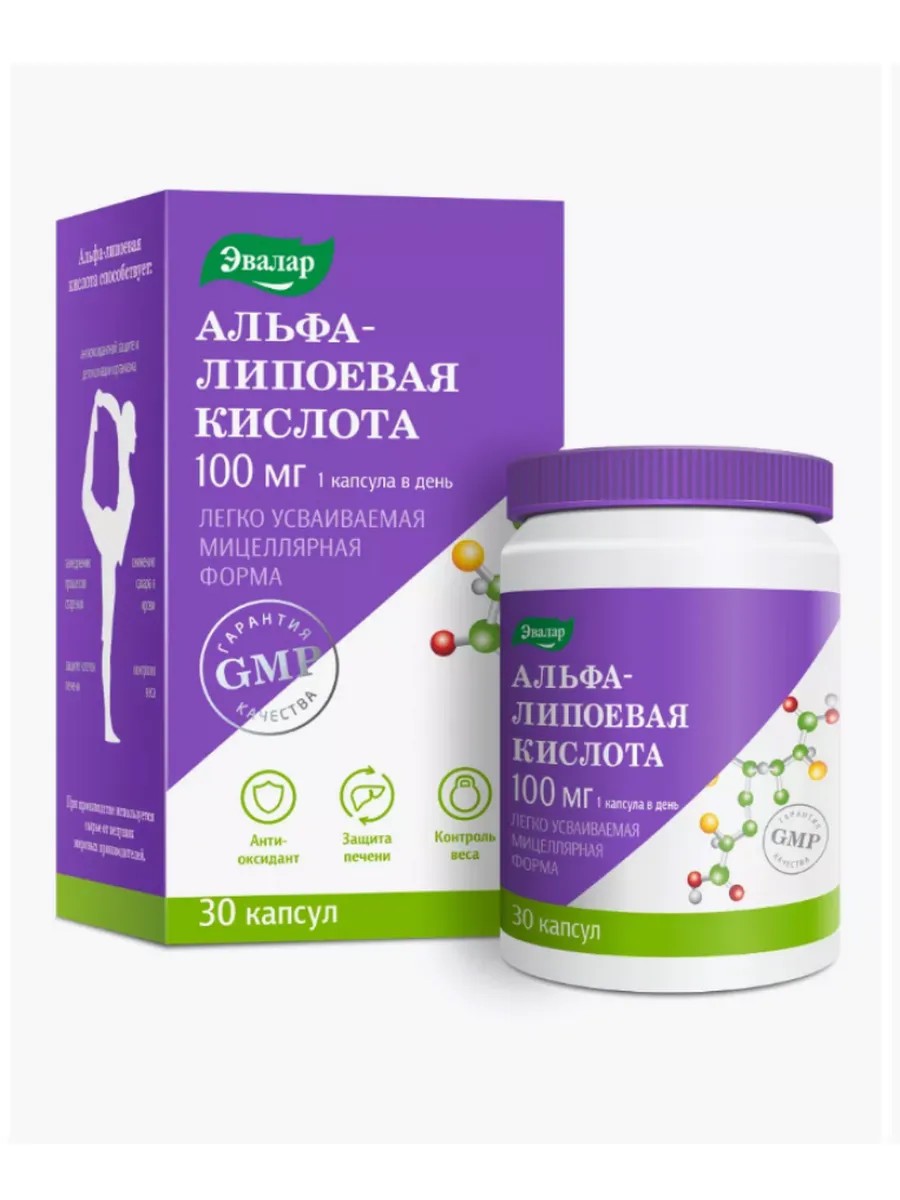 Alpha-lipoic acid 100 mg, 30 capsules is a dietary supplement that helps improve metabolism and protect cells from damage.