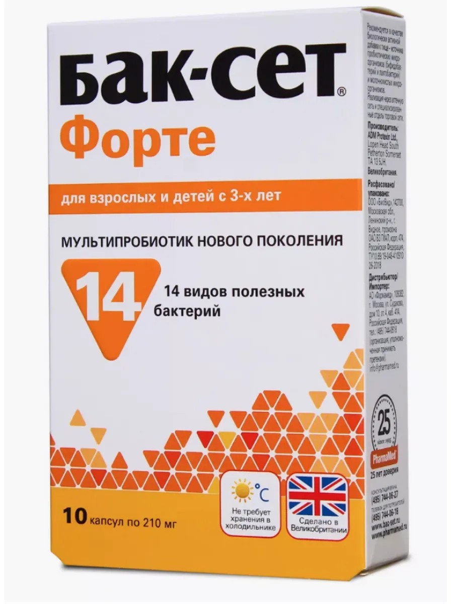 Бак-сет форте капс - мультипробиотический комплекс для восстановления микрофлоры кишечника. Подходит после антибиотикотерапии. Биологическое действие комплекса: в состав комплекса входят 14 видов живых пробиотических бактерий, которые усиливают и дополняют действие друг друга. Бак-Сет форте помогает восстановить микрофлору кишечника и нормализовать пищеварение при дисбактериозе, запорах, приеме антибиотиков, кишечных инфекциях, аллергических состояниях у детей старше 3-х лет и взрослых. Благодаря усовершенствованной микрокапсулированной технологии производства полезные бактерии, входящие в состав комплекса, сохраняют свою жизнеспособность и активность в течение всего срока годности и при этом не требуют хранения в холодильнике.
