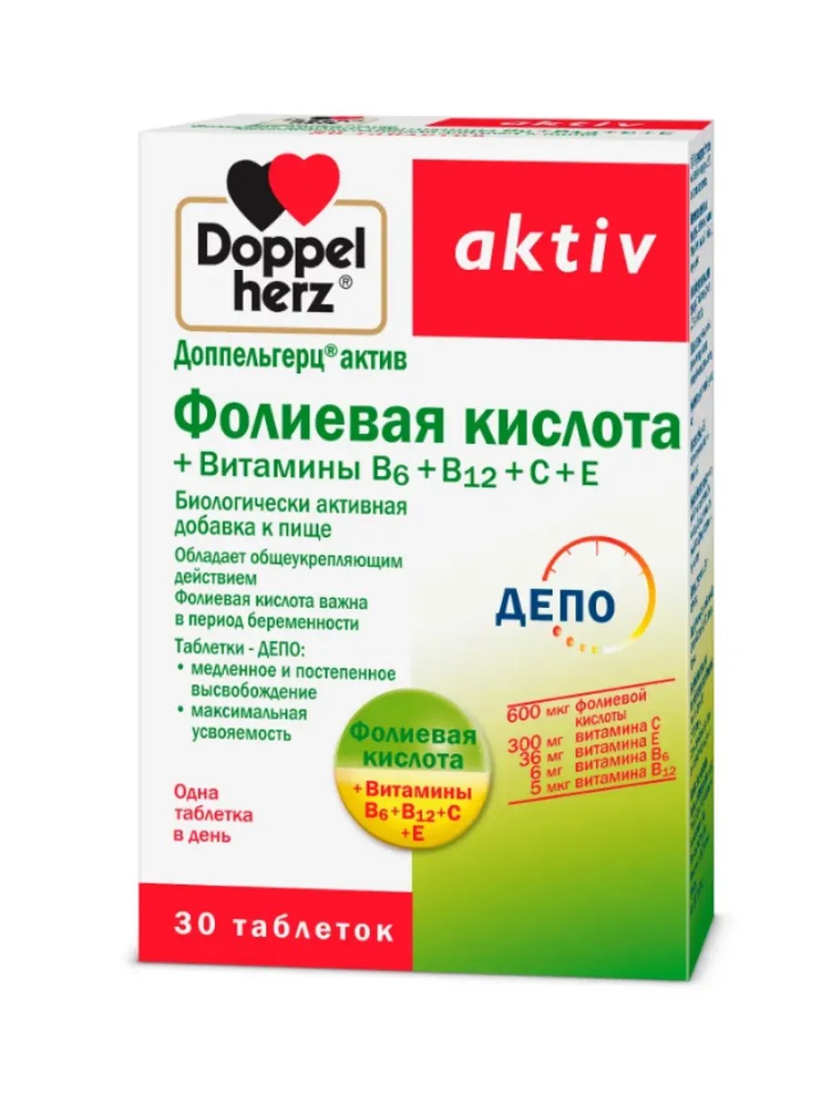 Доппельгерц Актив Фолиевая кислота+Вит.С+Вит.Е+Вит В6+Вит В12 - таблетки для женщин, рекомендованы при беременности. Поддерживают кроветворение, иммунитет и нервную систему. Биологически активная добавка (БАД) к пище, которая является дополнительным источником витаминов, оказывающим общеукрепляющее действие. Фолиевая кислота - это жизненно необходимый и незаменимый витамин, в котором организм нуждается для поддержания многочисленных процессов обмена веществ. Витамины В6, В12, С и Е играют ключевую роль в улучшении иммунитета, уменьшении уровня холестерина в крови и помогают защитить клетки от повреждений свободными радикалами. Таблетки - ДЕПО обеспечивают медленное и постепенное высвобождение активных веществ, что позволяет им максимально усваиваться клетками организма.