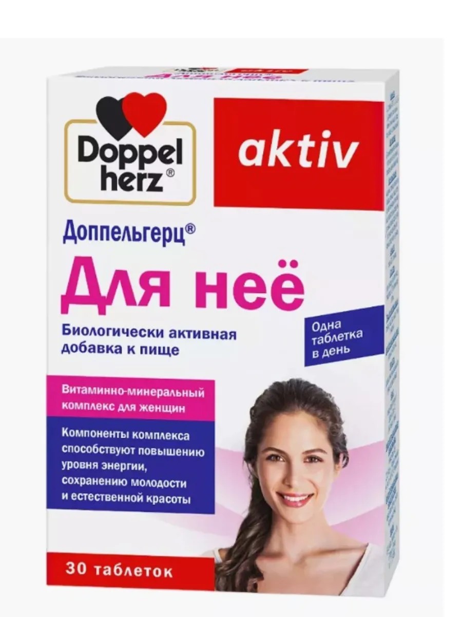 Доппельгерц Актив Для неё - таблетки с витаминами, железом и экстрактом сои для женского здоровья, гормонального баланса и красоты кожи. Компоненты комплекса способствует повышению уровня энергии, сохранению молодости и естественной красоты.