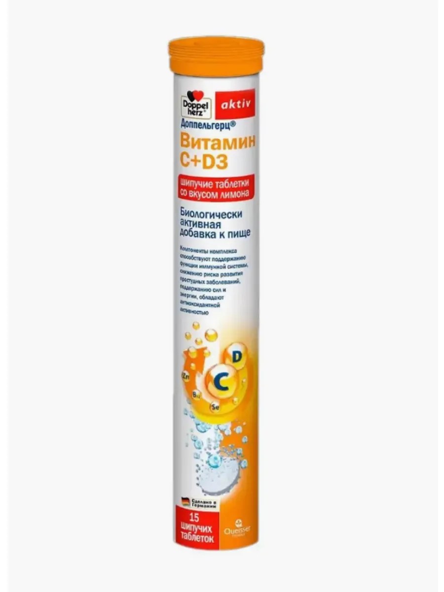 Доппельгерц Актив Витамин С+D3 - шипучие таблетки с витамином С и D3 для укрепления иммунитета, защиты от инфекций и улучшения усвоения кальция. Лимонный вкус. Доппельгерц актив витамин с+d3 шипучие таблетки со вкусом лимона - это биологически активная добавка (БАД) к пище. Компоненты комплекса способствуют поддержанию функции иммунной системы, снижению риска развития простудных заболеваний, поддержанию сил и энергии, а также обладают антиоксидантной активностью.