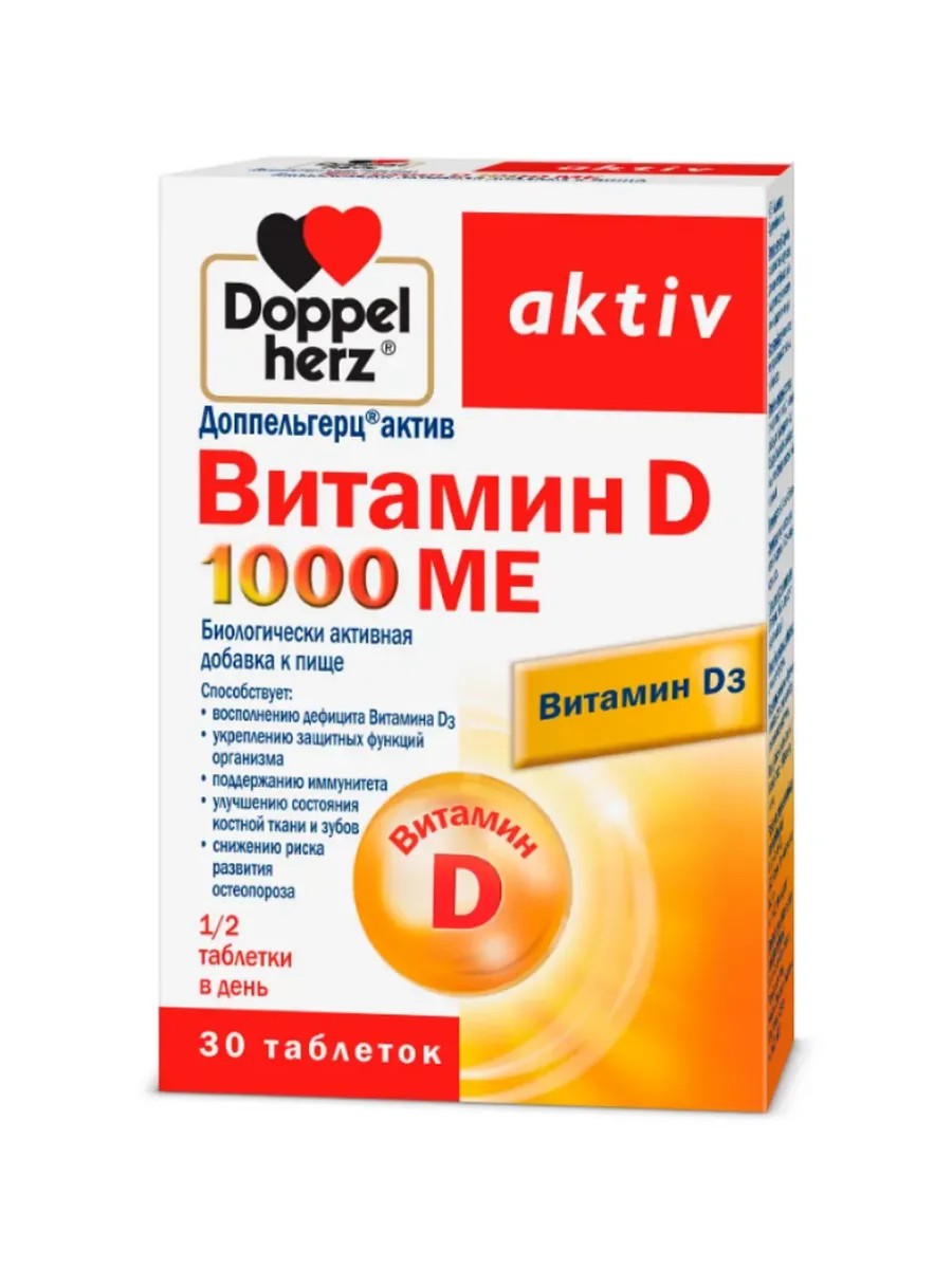Доппельгерц актив Витамин D 1000 ME - таблетки с витамином D для профилактики дефицита, поддержки костей и иммунитета.