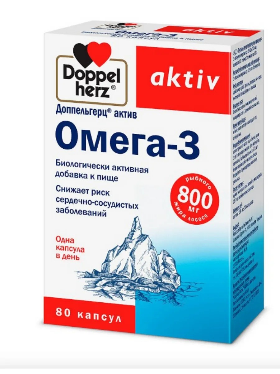 Доппельгерц актив омега-3 - это биологически активная добавка к пище на основе натуральных компонентов, созданный для поддержания здоровья и укрепления иммунитета. Препарат содержит в себе полезный рыбий жир, который богат полиненасыщенными жирными кислотами - Омега-3, способствующими укреплению сердечно-сосудистой системы. Кроме того, Доппельгерц Актив Омега-3 помогает улучшить память, повышает устойчивость организма к стрессам и болезням. Препарат представлен в форме капсул, каждая из которых содержит оптимальную дозу полезных веществ, необходимую для поддержания здоровья. Люди, двигающиеся мало, вегетарианцы и старше 40 лет, как правило, нуждаются в дополнительном приеме Омега-3. Омега-3 положительно влияют на снижение липопротеинов низкой плотности, нормализуют соотношение холестерина и триглицеридов в крови, что очень важно в борьбе с заболеваниями сердечно-сосудистой системы, в том числе атеросклерозом.
