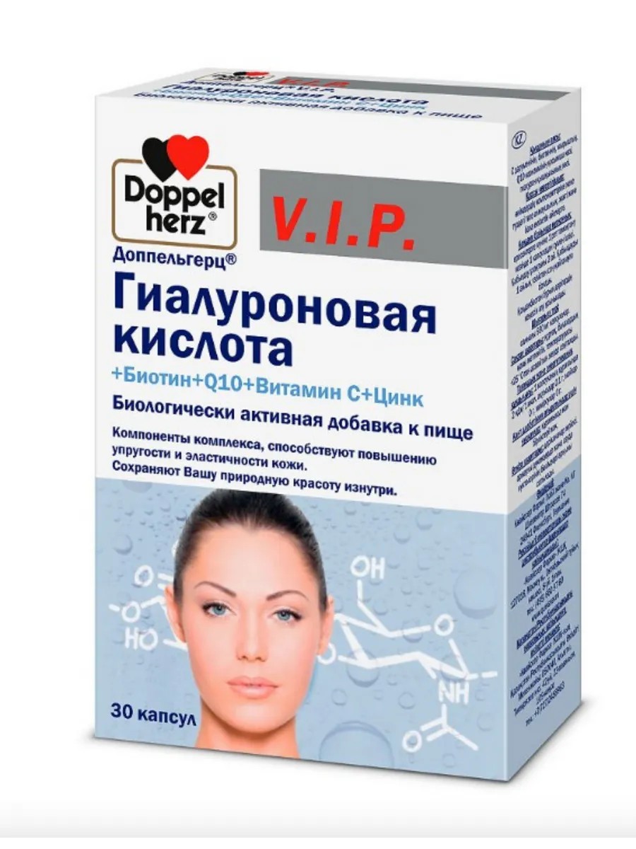 Доппельгерц ВИП Гиалуроновая кислота + Биотин+Q10+Витамин С+Цинк - это комплексный препарат, предназначенный для поддержки здоровья кожи, волос и ногтей. Каждая капсула содержит гиалуроновую кислоту, которая улучшает эластичность и увлажнение кожи, биотин и цинк, необходимые для здоровья волос и ногтей, а также коэнзим Q10 и витамин С, укрепляющие иммунную систему и повышающие устойчивость организма к воздействию свободных радикалов. Препарат рекомендуется в качестве дополнения к основному рациону питания, а также при снижении уровня гиалуроновой кислоты в организме при старении. Способ применения и дозы