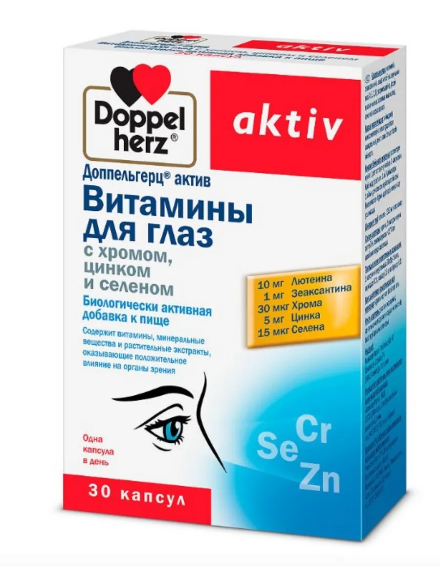 Doppelherz Active Eye Vitamins contain chromium, zinc, and selenium, which are essential microelements for maintaining eye health and improving vision.