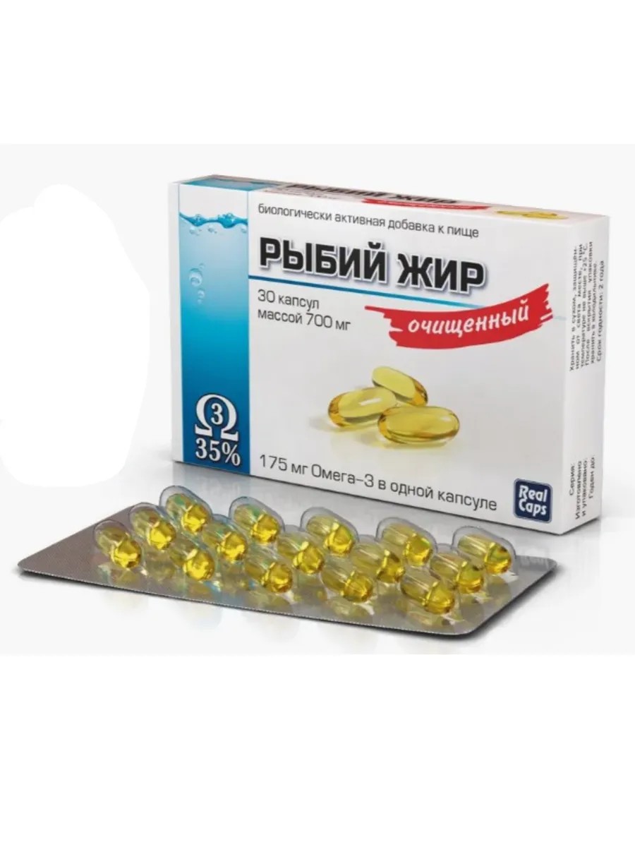 Рыбий жир очищенный – это биологически активная добавка (БАД) к пище, которая содержит полезные жирные кислоты Омега-3, в том числе эйкозапентаеновую (EPA) и докозагексаеновую (DHA) кислоты. Они являются важными компонентами для здоровья сердечно-сосудистой системы, а также имеют лечебный эффект при некоторых заболеваниях. При регулярном употреблении рыбий жир улучшает состояние кожи, волос и ногтей, снижает уровень холестерина, улучшает зрение и память. Омега-3 – необходимый элемент в образовании клеточных мембран тканей всего организма, а также миелиновых оболочек нервных клеток, участвующих в проведении нервных импульсов. Рыбий жир очищенный выработан из рыбы с коротким жизненным циклом (Анчоусовые, Ставридовые, Корюшковые, Песчанковые), выловленной в Северном и Норвежском морях. Жир произведен с применением современных высокотехнологичных методов очистки. Рекомендованная дозировка взрослым и детям старше 14 лет: капсулы массой 700 мг – по 2-8 капсул 1-2 раза в день во время еды. Беременным и кормящим женщинам: капсулы массой 700 мг – 4-6 капсул в день во время еды по согласованию с лечащим врачом. Продолжительность приёма 1 месяц. При необходимости приём можно повторять 3-4 раза в год. Перед применением рекомендуется проконсультироваться с врачом.