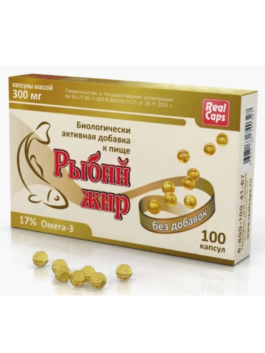 Рыбий жир - это пищевая добавка, содержащая жирные кислоты Омега-3, которые необходимы для поддержания здоровья сердца, жизненного тонуса и работы мозга. Капсулы "РеалКапс" содержат 100 штук рыбьего жира, который был получен из рыбьего жира печени трески. Каждая капсула содержит жирные кислоты Омега-3 (EPA и DHA). Этот продукт можно использовать как профилактический препарат для улучшения работы организма, а также в качестве дополнительного источника жирных кислот Омега-3. Капсулы "РеалКапс" рекомендуется принимать взрослым и детям старше 14 лет по 3 капсулы 3 раза в день во время еды. Рыбий жир способствует: