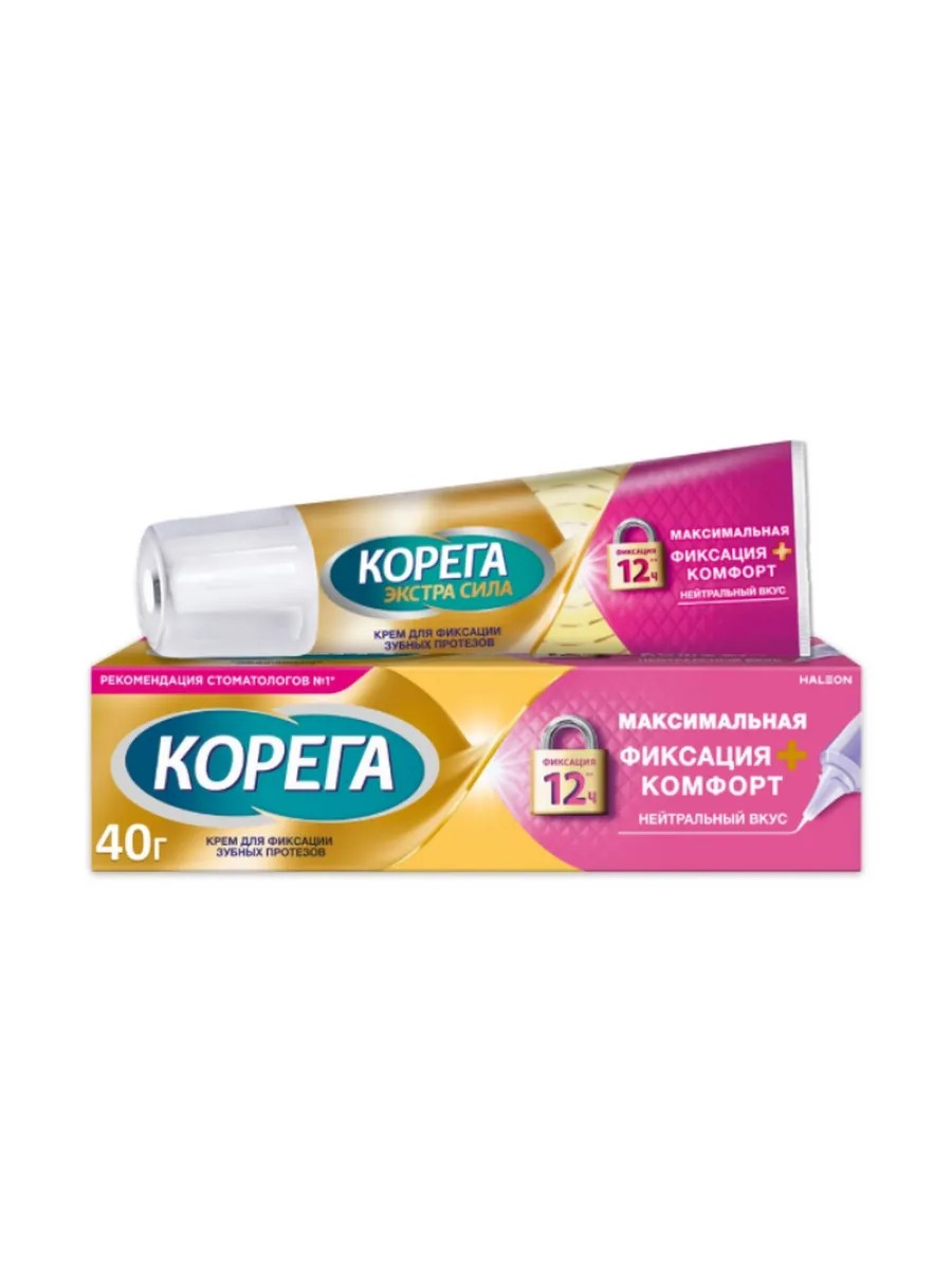 Корега Максимальная фиксация+Комфорт крем для фиксации протезов - крем с усиленной фиксацией и амортизирующим эффектом. Подходит для активного образа жизни, уменьшает трение и равномерно распределяет нагрузку.