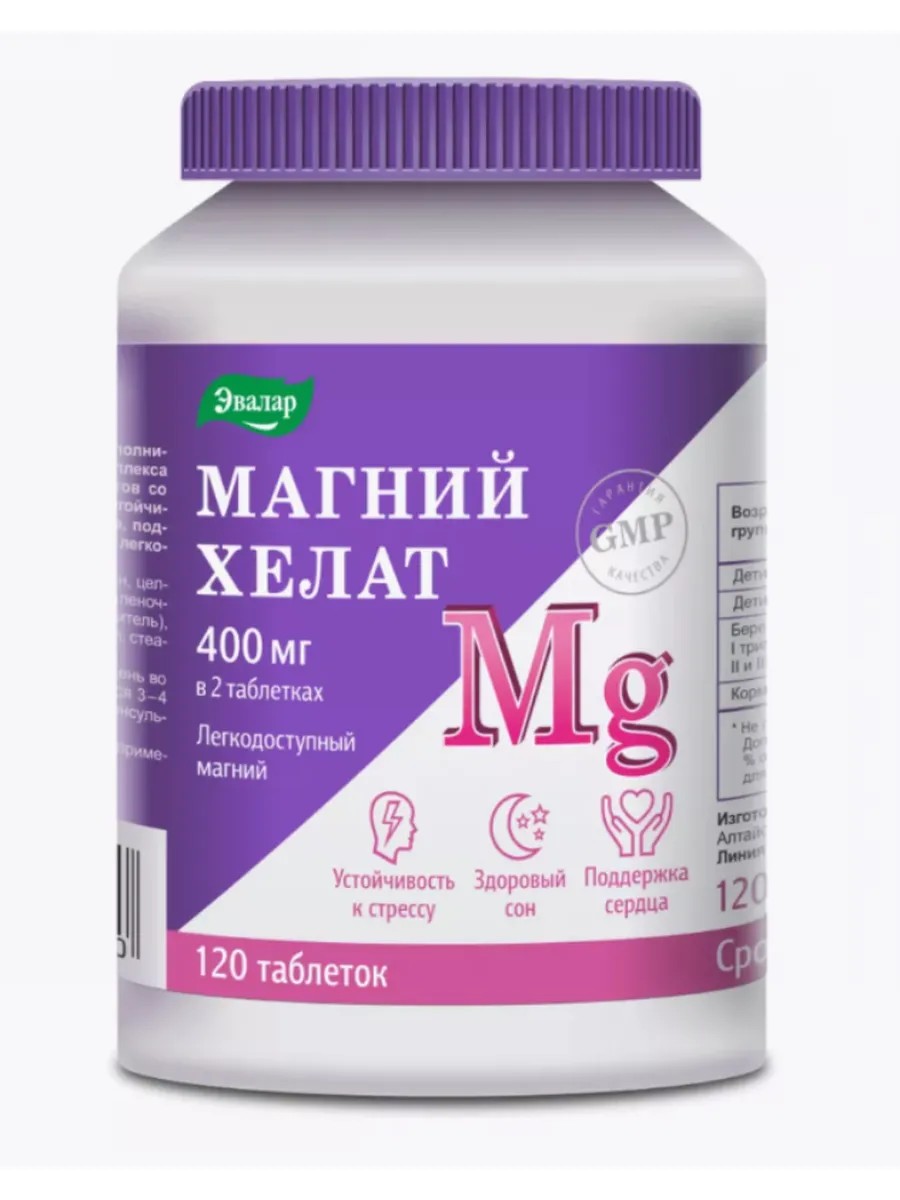 Magnesium Chelate Evalar supports healthy nervous system, muscle, and heart function, helps relieve muscle spasms and cramps, normalizes sleep, and increases the body's resilience to stress.
