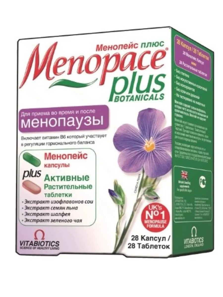 Менопейс Плюс капс + табл - комбинированный препарат для женщин в период менопаузы. Содержит витамины, минералы и растительные экстракты для улучшения самочувствия. Менопейс плюс капсулы + таблетки - это биологически активная добавка к пище, созданная специально для женщин, которые находятся в периоде менопаузы . Таблетки содержат натуральные фитоэстрогены (экстракт сои, экстракт листьев шалфея, экстракт зеленого чая, экстракт семян льна), которые помогают поддержать гормональный баланс организма и уменьшить проявления климакса, такие как головные боли, потливость, нарушения сна и др. Кроме того, Менопейс капсулы содержат витамины и микроэлементы, способствуют укреплению костей, помогают снизить риск возникновения сердечно-сосудистых заболеваний, улучшают состояние кожи, волос и ногтей.
