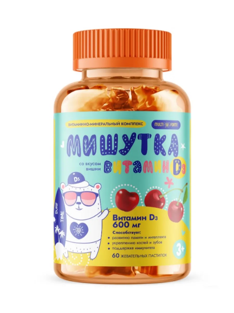 Mishutka Vitamin D3 MultiForte Marmalades are chewable lozenges with vitamin D3 for strengthening bones and immunity in children.