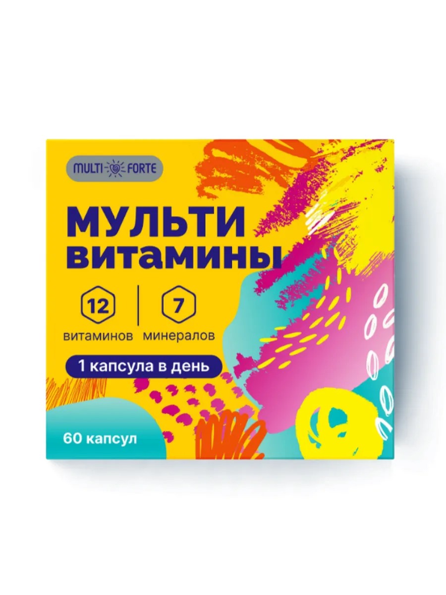 Мультивитамины (витамины и минералы) для взрослых MultiForte капс - капсулы с мультивитаминами для укрепления иммунитета и восполнения дефицита питательных веществ. В качестве биологически активной добавки к пище – источника витаминов: A, С, D3, E, B1, B2, B5, B6, B12, биотина, фолиевой кислоты, ниацина, железа, марганца, меди.