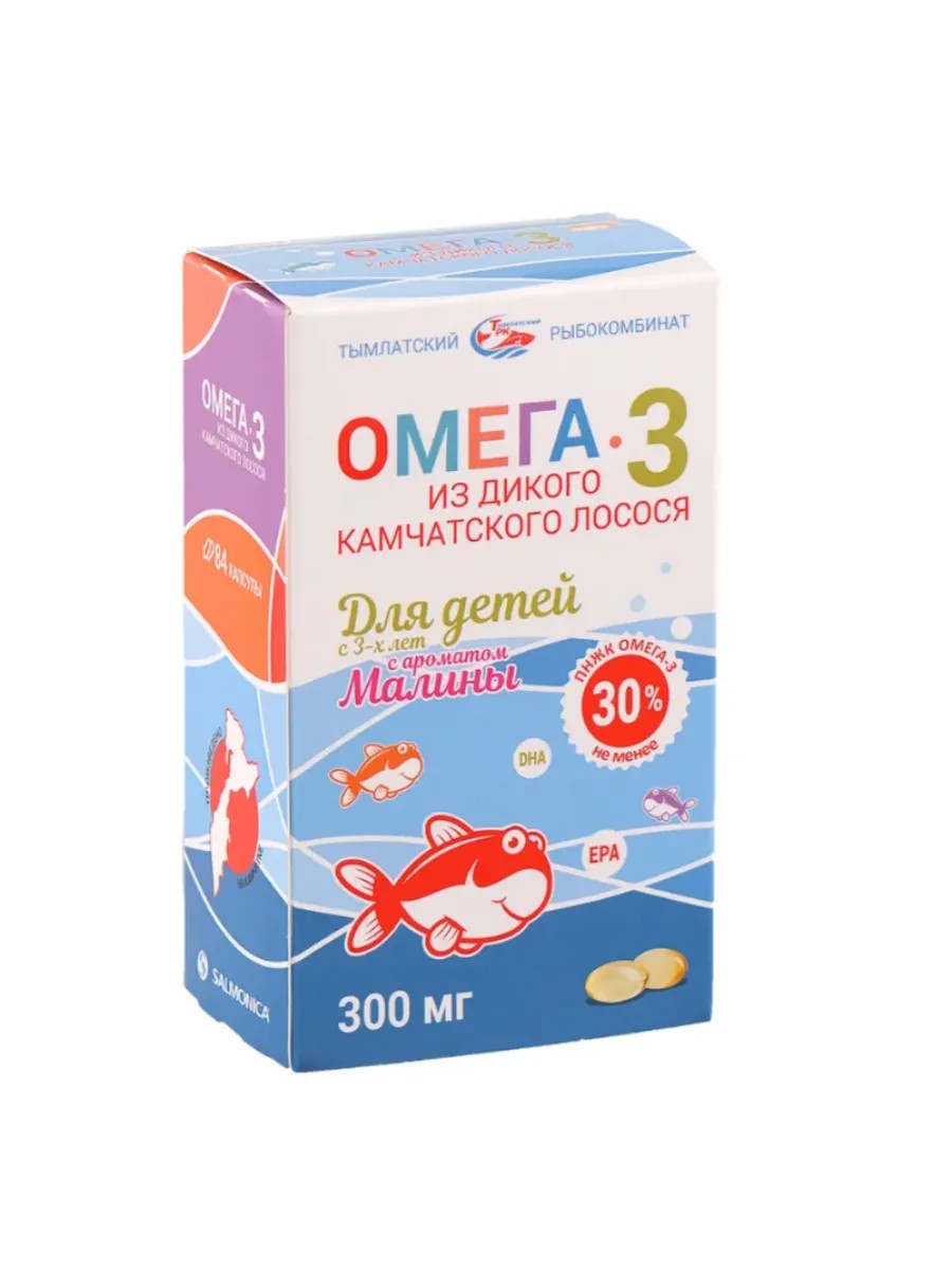 Омега-3 из дикого камчат лосося капсулы д/дет с 3-х лет (малина) - жевательные капсулы с Омега-3 для детей с 3 лет. Вкус малины делает прием приятным, а Омега-3 поддерживает развитие мозга и иммунитет. Омега- 3, это важный компонент детского рациона, особенно в условиях повышенной умственной нагрузки во время обучения в школе. Содержит полиненасыщенные жирные кислоты (ПНЖК). ПНЖК Омега-3 относятся к незаменимым жирным кислотам, так как не синтезируются в организме человека и должны поступать в достаточном количестве извне. Полиненасыщенные жирные кислоты Омега-3 необходимы для нормального роста и развития ребенка, для полноценного функционирования органов и систем. Оказывают выраженное положительное влияние на здоровье ребенка. ПНЖК Омега-3 способствуют нормализации обменных процессов в организме, снижают активность воспалительных процессов, способствуют укреплению и поддержанию иммунитета, нормальному росту костей и мышц, активности работы мозга. ПНЖК Омега-3 тормозят процессы тромбообразования, нормализуют мозговое кровообращение, повышают устойчивость сосудов головного мозга при гипоксии и падении артериального давления, обладают противовоспалительным действием. ПНЖК Омега-3 являются важной составной частью биологических мембран, способствуют нормальному функционированию стенок сосудов, нервных клеток, могут оказывать влияние на улучшение концентрации внимания, способствуют снижению симптомов повышенной тревожности у детей, могут влиять на снижение агрессии у детей, особенно, в переходном возрасте. Ежедневный прием Омега-3 способствует поддержанию эластичности и упругости кожи, уменьшению воспалительных процессов, и как следствие общее оздоровление кожи, ногтей и волос