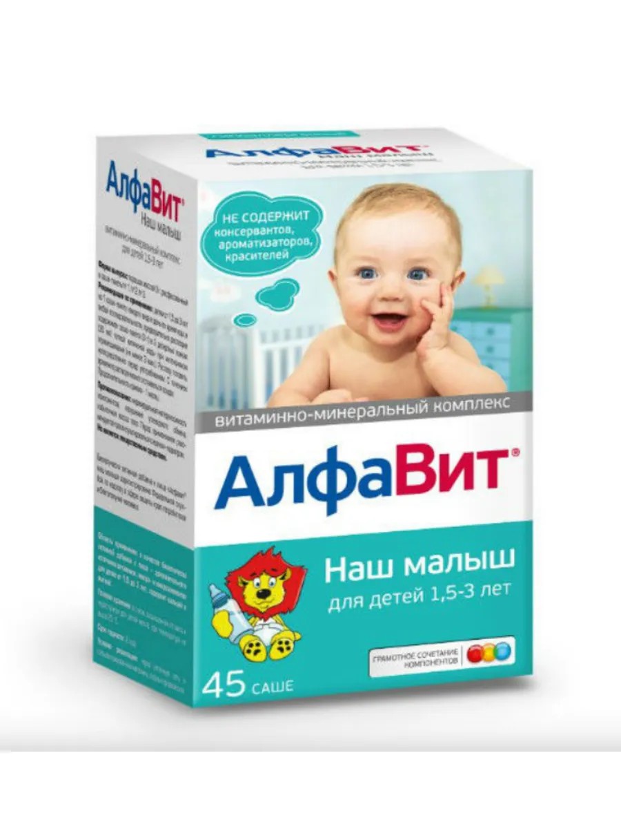Алфавит Наш Малыш - витамины в форме порошка для детей от 1 до 3 лет. Укрепляют иммунитет, способствуют росту и развитию. Алфавит Наш Малыш - это биологически активная добавка к пище, которая содержит все необходимые витамины, минералы и микроэлементы для здоровья и развития ребенка с 1,5 до 3-х лет. Алфавит Наш Малыш выпускается в виде полрошка в удобных саше, который легко разводится в воде. Препарат помогает укрепить иммунитет, способствует нормальному развитию костной ткани и формированию здоровых зубов. Алфавит Наш Малыш - это залог здоровья и перспектив успеха вашего малыша!