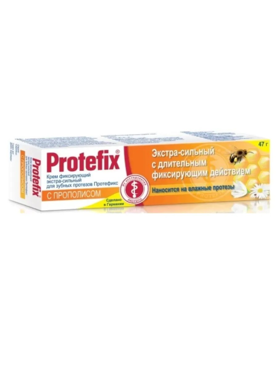 Протефикс крем фиксирующий экстра-сильный (с прополисом) - крем с прополисом для дополнительной антибактериальной защиты. Укрепляет десны, снимает воспаление. Крем фиксирующий экстра-сильный для зубных протезов с прополисом - это современное средство для удержания зубных протезов на месте в течение всего дня. Благодаря богатому составу прополис обладает противомикробным, противовоспалительным, иммуномодулирующим и антиоксидантным действием, что доказано во многих клинических исследованиях. Использование крема для зубных протезов с Протефикс с прополисом способствует заживлению ран и натёртостей в ротовой полости, а также способствует улучшению качества фиксирующего свойства крема, повышает герметизацию протезов.