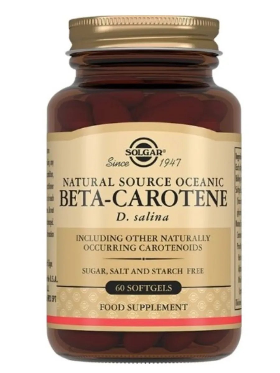 Солгар Бета-каротин из океанич водоросли D.Salina капс - источник бета-каротина для поддержки зрения, кожи и иммунитета. Улучшает состояние кожи и защищает от свободных радикалов. Бета-каротин является предшественником витамина А, который способствует улучшению сумеречного зрения, увлажнению слизистой оболочки глаз, снижению ощущения «песка» в глазах.