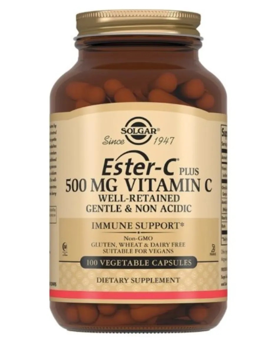 Solgar Ester-C Plus Vitamin C 500 mg is a dietary supplement that helps increase the body's resistance to infections, promotes collagen synthesis, and strengthens blood vessel walls.