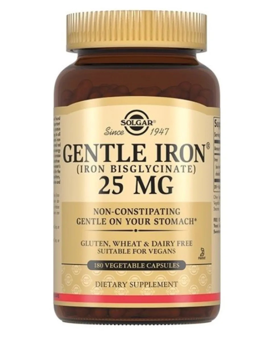 Солгар «Легкодоступное железо Джентл Айрон» содержит 25 мг железа в органической форме. Эта форма легко усваивается и снижает риск развития нежелательных эффектов со стороны желудочно-кишечного тракта.
